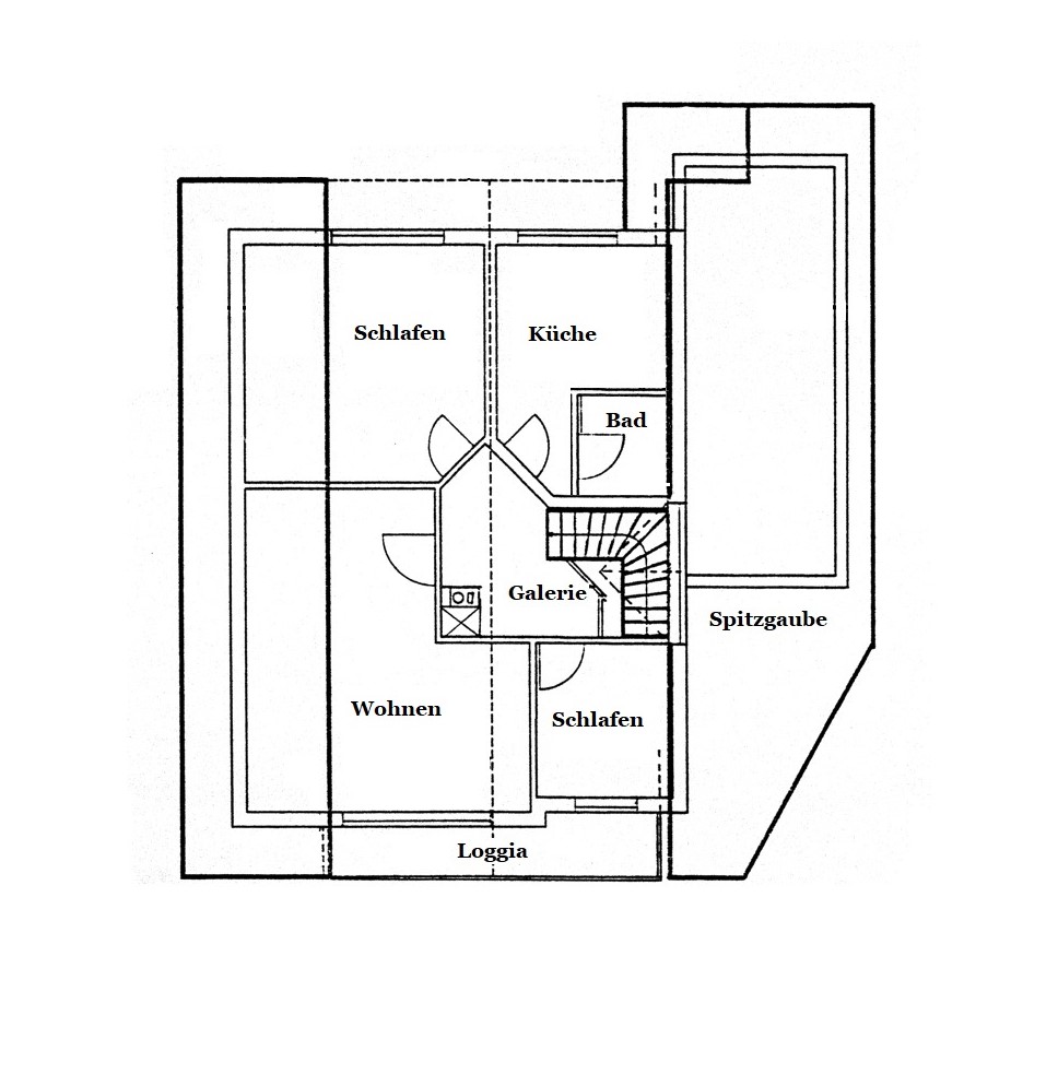 Im Dachgeschoss wartet Potenzial: eine gemütliche Einliegerwohnung mit zwei Schlafzimmern, kleinem Bad, vorbereiteter Küche und großem Wohnraum mit Südbalkon – ideal für Familie oder Gäste.