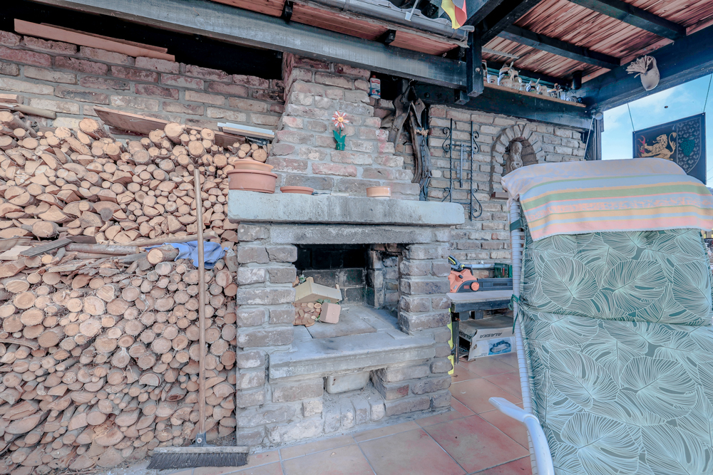 Vom Wohnbereich erfolgt der Zugang zur überdachten Terrasse (Genehmigung derzeit nicht belegbar) mit Außenkamin und der angrenzenden Gartenfläche.