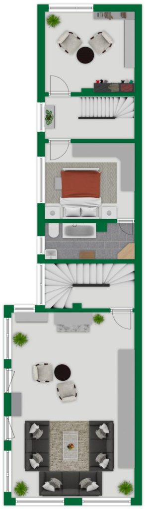 Obergeschoss: Ursprünglich 3 Zimmer + Flur, welche nachträglich zu einem sehr großen, lichtdurchfluteten Raum mit Balkon und Kaminofen zusammengeführt wurden.