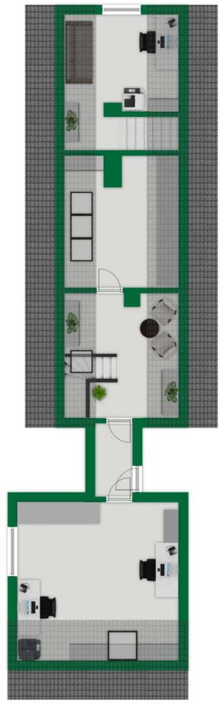 Der spätere Anbau erweitert das Ensemble um ein besonders großzügiges Raumgefühl und moderne Nutzungsmöglichkeiten. Die Dachgeschossfläche ist ausgebaut, jedoch nicht in der offiziellen Wohnflächenberechnung enthalten.