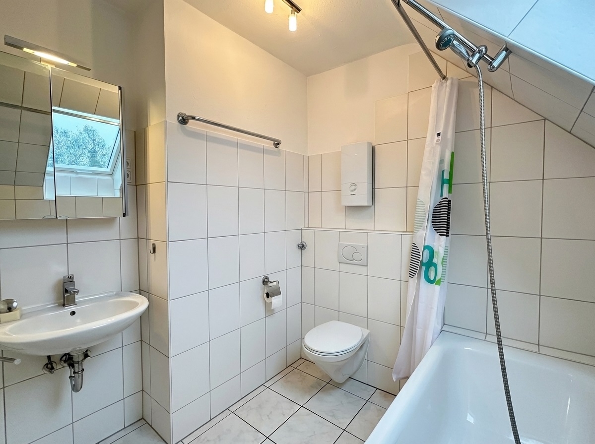 Das Badezimmer ist mit einer Badewanne ausgestattet und verfügt ebenfalls über ein Dachflächenfenster, was für gute Belichtung und Belüftung sorgt.
