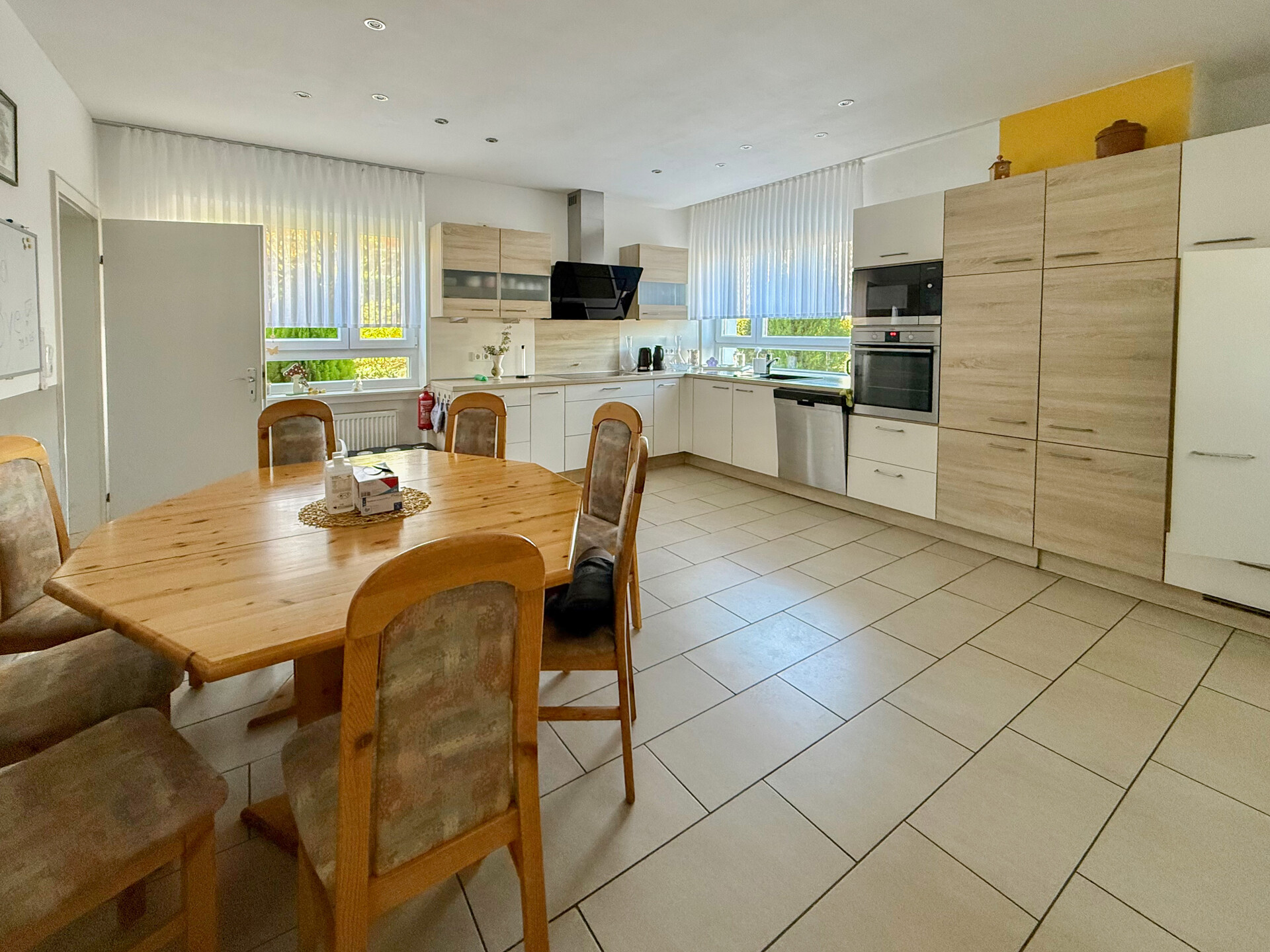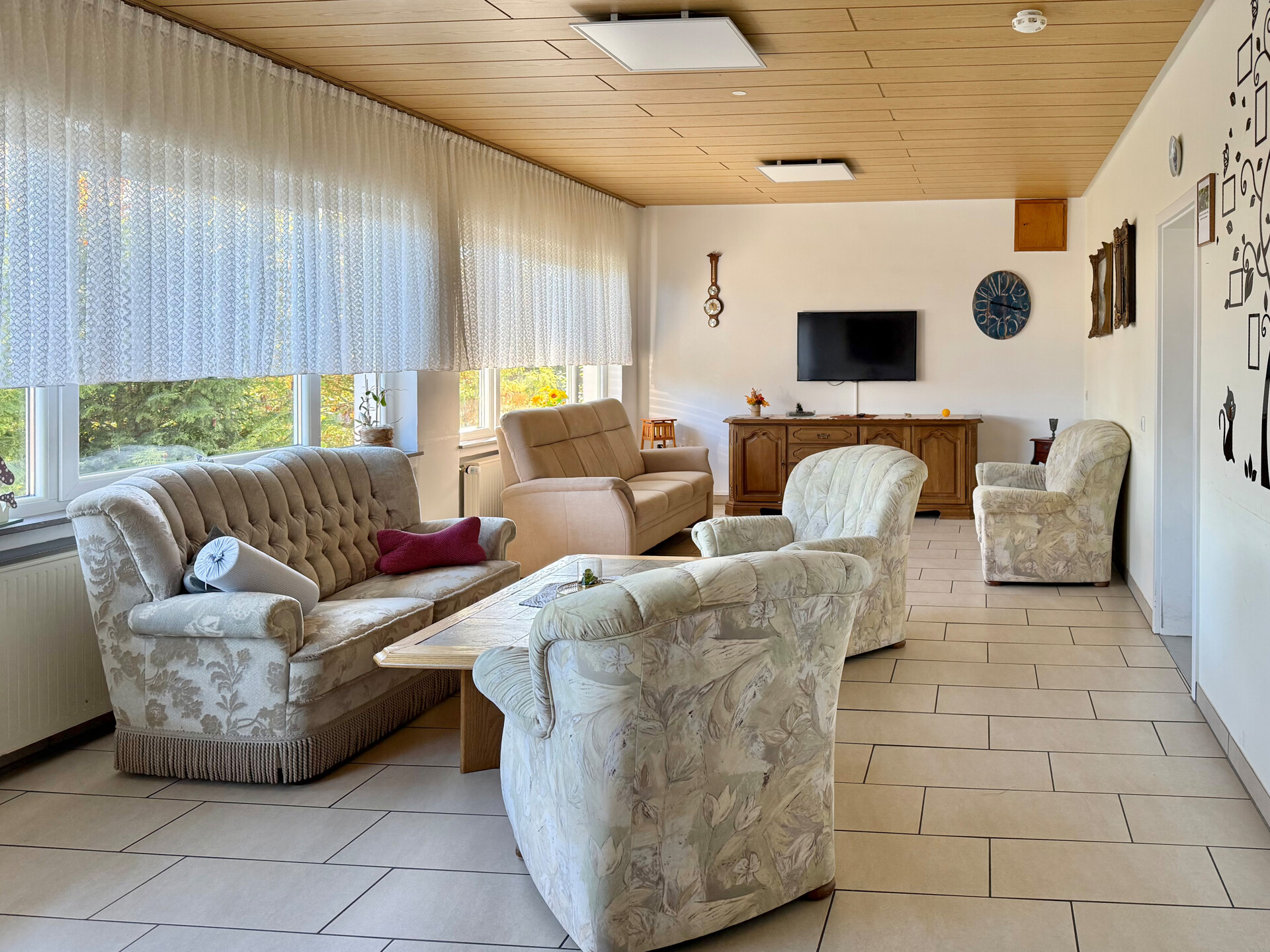 Die Wohnfläche beträgt ca. 285 m², ergänzt durch 142 m² Nutzfläche. Helle, freundliche Zimmer, ein großer Aufenthaltsraum mit Wohnküche sowie ein Balkon mit Fernblick sorgen für ein wohnliches Umfeld. Das parkähnliche Grundstück umfasst ca. 3.459 m² mit Terrasse, Garten, 1.552 m² Waldfläche und zahlreichen befestigten Stellplätzen. Das Inventar kann bei Bedarf übernommen werden.