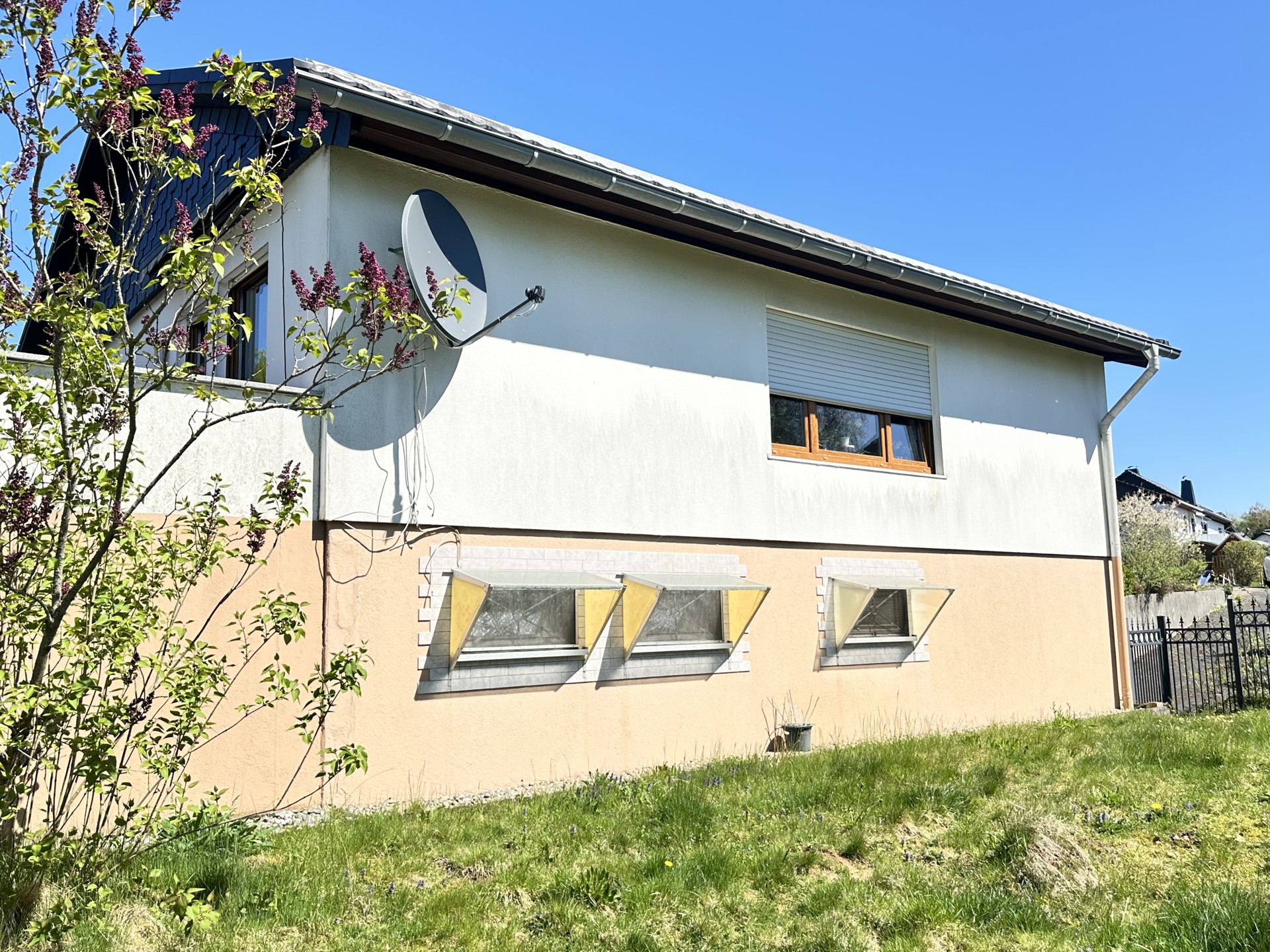 Dieses einladende Wohnhaus im beliebten Bungalowstil der renommierten Firma Fingerhut bietet den idealen Rückzugsort für Paare, die Wert auf Ruhe und Wohnkomfort legen. Nach dem Erwerb wurde das Objekt durch die Eigentümer renoviert und präsentiert sich heute in einem gepflegten Zustand. Das modernisierte Badezimmer verfügt bereits über eine Dusche mit flacher Einstiegshöhe. Herzstück des Hauses ist der großzügige Wohn- und Essbereich, von dem aus Sie direkten Zugang zur sonnigen Terrasse haben. Von hier genießen Sie den Ausblick auf das weitläufige, pflegeleicht angelegte Grundstück, das durch einen Zaun eingefriedet ist. Ein Gartenhaus eröffnet vielfältige Nutzungsmöglichkeiten. Im Untergeschoss stehen Ihnen zusätzliche Nutz- und Abstellflächen sowie eine praktische Waschküche mit Toilette und Waschbecken und ein Gästezimmer zur Verfügung. Abgerundet wird das attraktive Gesamtbild durch zwei Garagen, die ausreichend Platz für Ihre Fahrzeuge bieten. Dieses gemütliche Zuhause überzeugt mit einer guten Raumaufteilung und einer Umgebung, in der man sich sofort wohlfühlt. Es eignet sich ideal für Paare, die auf der Suche nach einem im Erdgeschoss ebenerdigen Zuhause mit viel Platz im Innen- und Außenbereich sind.