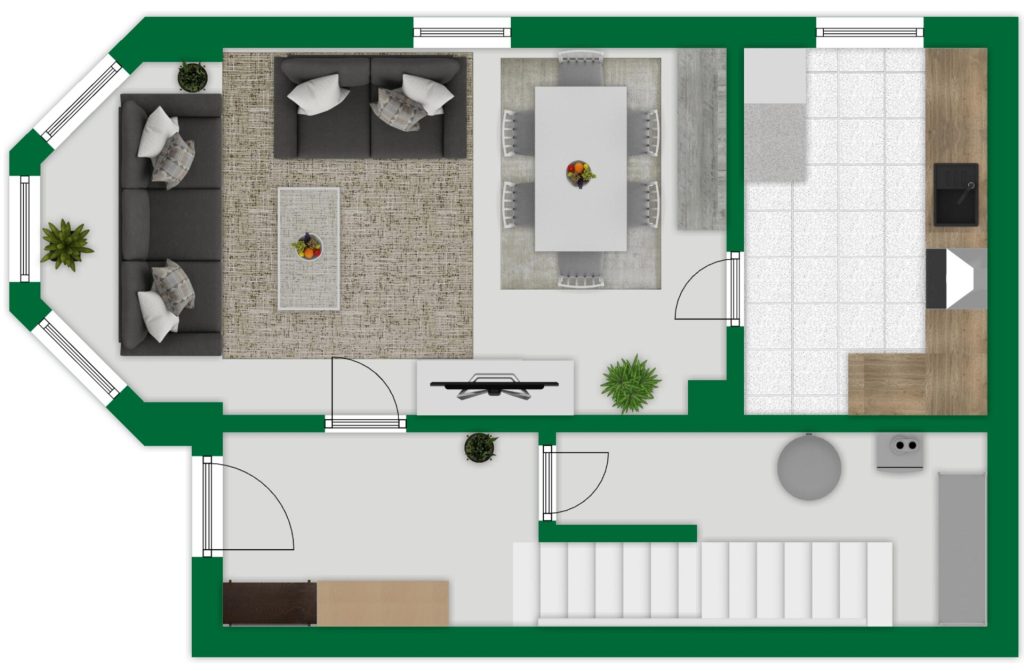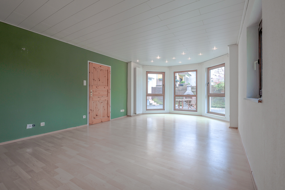 Nach dem Betreten des Hauses gelangt man zunächst in die Diele. Von hier aus führt der Weg geradeaus in den Heizungsraum, der gleichzeitig als Waschküche genutzt wird. In diesem Zusammenhang ist zu beachten, dass der Energieausweis im Jahr 2017 erstellt wurde und anschließend eine neue Heizungsanlage eingebaut wurde. Von der Diele aus erreicht man außerdem über eine Treppe das Obergeschoss. Zur linken Seite öffnet sich der Wohn- und Essbereich mit dem charakteristischen Erker, der für viel Licht und eine angenehme Wohnatmosphäre sorgt. Angrenzend befindet sich die Küche, die inklusive Einbauküche angeboten wird.