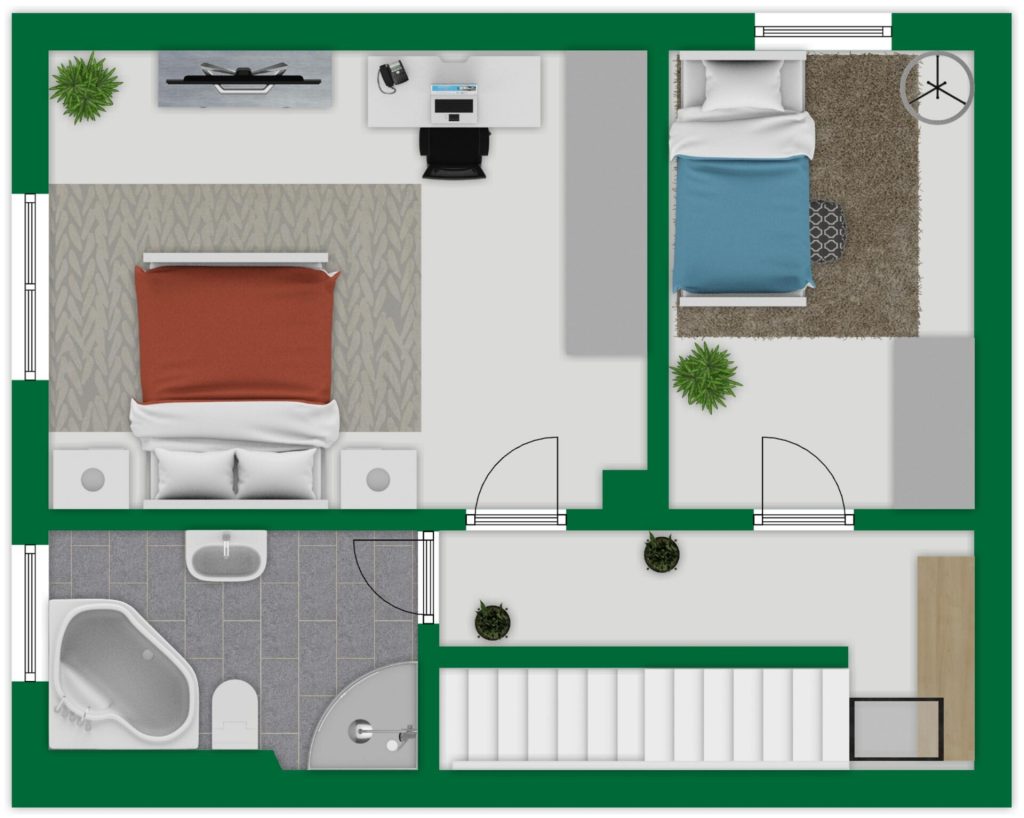 Im Obergeschoss befinden sich ein zentraler Flur, zwei Schlafzimmer sowie ein Badezimmer. Das Bad ist mit einer Eckbadewanne, einer Eckdusche, einem Waschbecken, einem WC, einem Handtuchheizkörper sowie einem Fenster ausgestattet. Im Flur sorgt eine Lichtkuppel in der Decke, die Tageslicht von oben einfallen lässt, für eine freundliche und helle Atmosphäre.