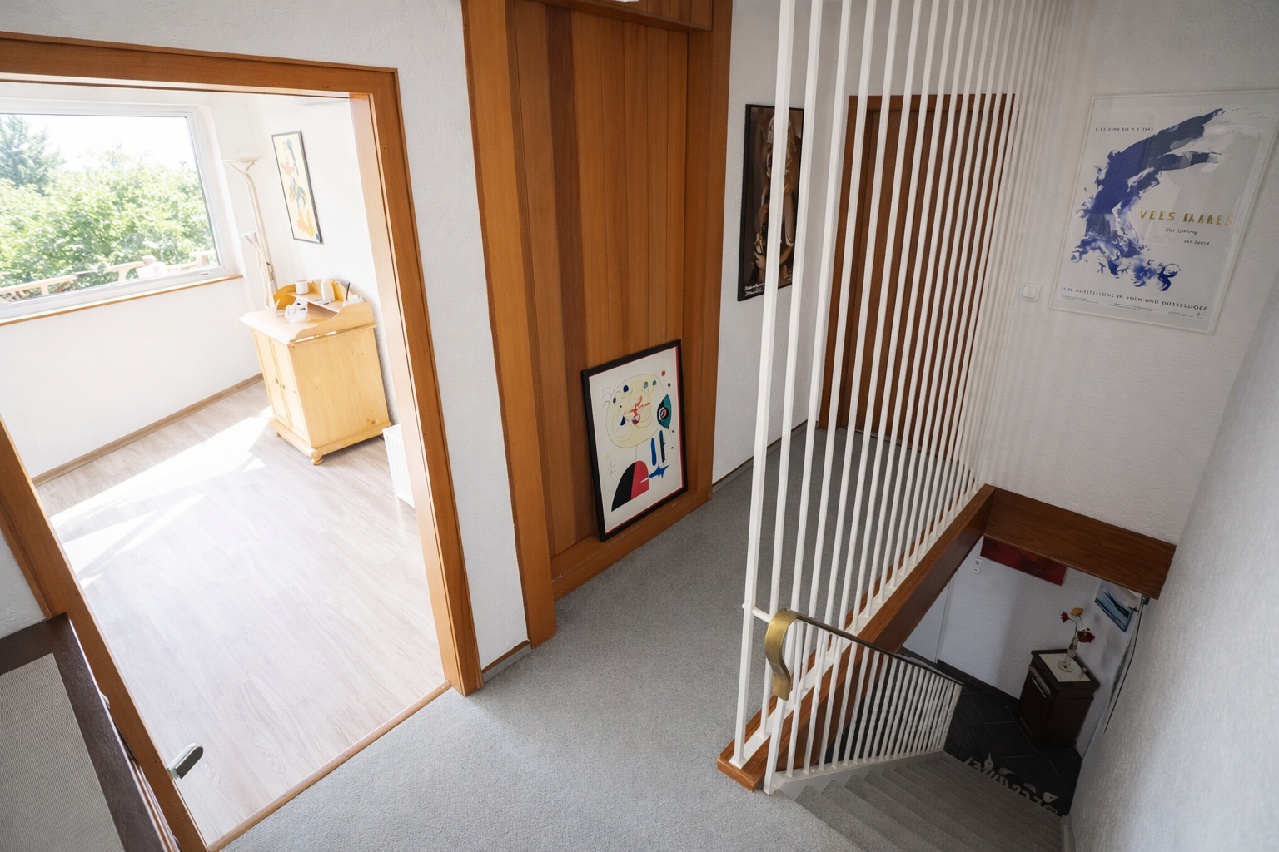 Entlang der Diele befinden sich außerdem zwei weitere geräumige Zimmer, die sich hervorragend als Schlafzimmer, Kinderzimmer oder Gästezimmer nutzen lassen. Über die Treppe gelangen Sie in das Obergeschoss. Hier empfängt Sie eine weitere Diele, von der aus ein Gäste-WC mit kleiner Abstellkammer sowie der Zugang zum Spitzboden erreichbar sind.