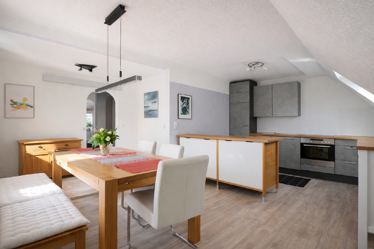 Das Herzstück dieser Etage bildet der großzügige, offen gestaltete Küchen- und Essbereich mit viel Platz für eine moderne Küchenzeile und einen großen Esstisch. Von hier aus gelangen Sie direkt in das helle und geräumige Wohnzimmer. Ein besonderes Highlight ist der schöne Weitblick über die Umgebung. Ebenfalls vom Wohnzimmer aus erreichen Sie die großzügige Dachterrasse mit ca. 34 m² Fläche und Südausrichtung. Hier genießen Sie den ganzen Tag Sonne.