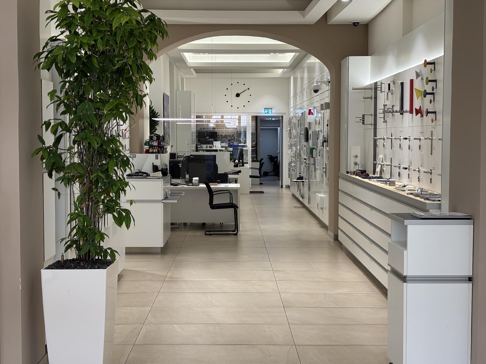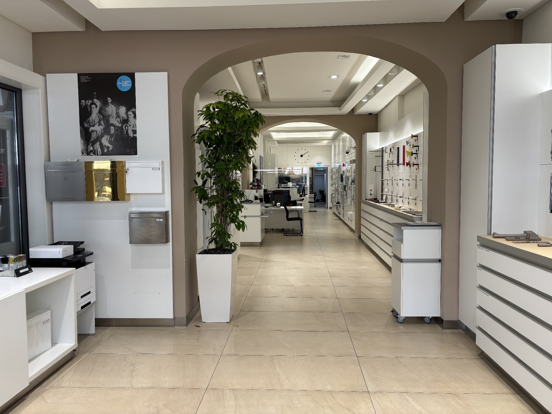Altbautypische hohe Decken, großformatige, helle Bodenfliesen und große Fenster sorgen für eine helle und einladende Atmosphäre. Die Wände sind weiß gestrichen und die Klimaanlage sorgt für stets angenehme Temperaturen.