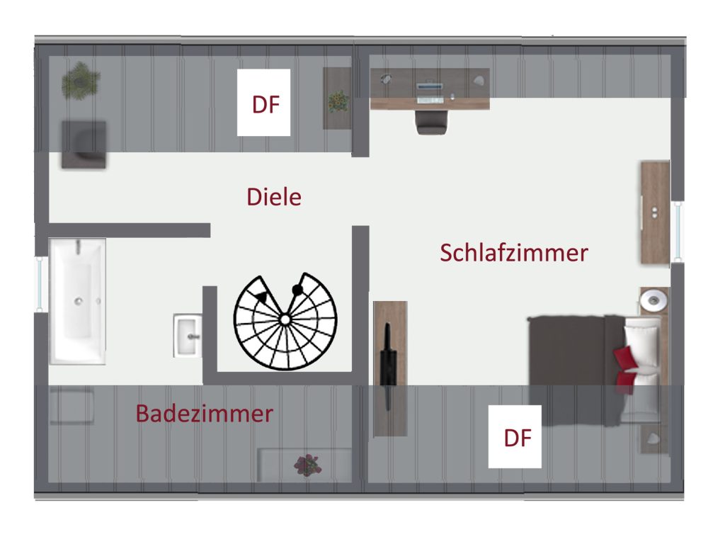 Im Obergeschoss gelangen Sie über eine Wendeltreppe aus dem Wohnzimmer. Diese Etage bietet ein geräumiges, lichtdurchflutetes Schlafzimmer sowie ein großzügiges Wannenbad mit Fenster. Die Diele im Obergeschoss ist ebenfalls geräumig und vielseitig nutzbar.