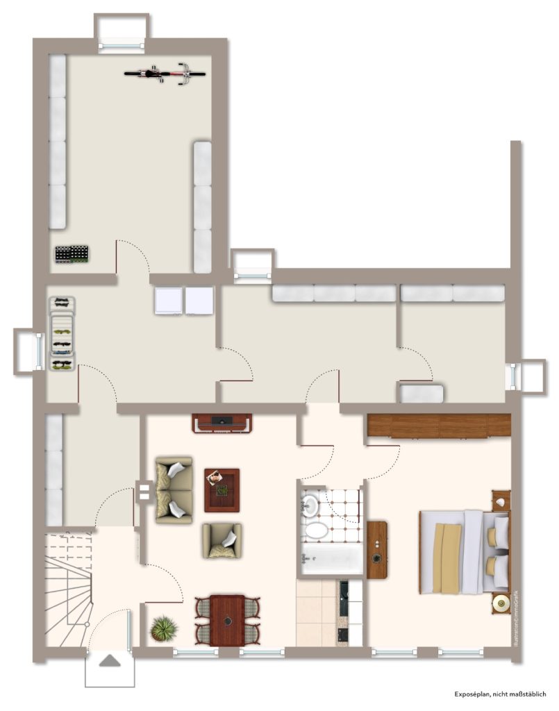 Im Obergeschoss entfaltet sich die Hauptwohnung auf großzügigen 113 m². Hier erwartet Sie ein lichtdurchflutetes Wohn- und Esszimmer mit Zugang zur Terrasse und dem liebevoll angelegten Garten. Die moderne Küche und das stilvolle Badezimmer mit Doppelwaschtisch und Dusche bieten höchsten Komfort. Das Elternschlafzimmer ist einladend und das große Kinderzimmer kann bei Bedarf leicht in zwei separate Räume mit eigenen Eingängen umgewandelt werden. Das Haus ist gepflegt muss aber komplett renoviert werden.