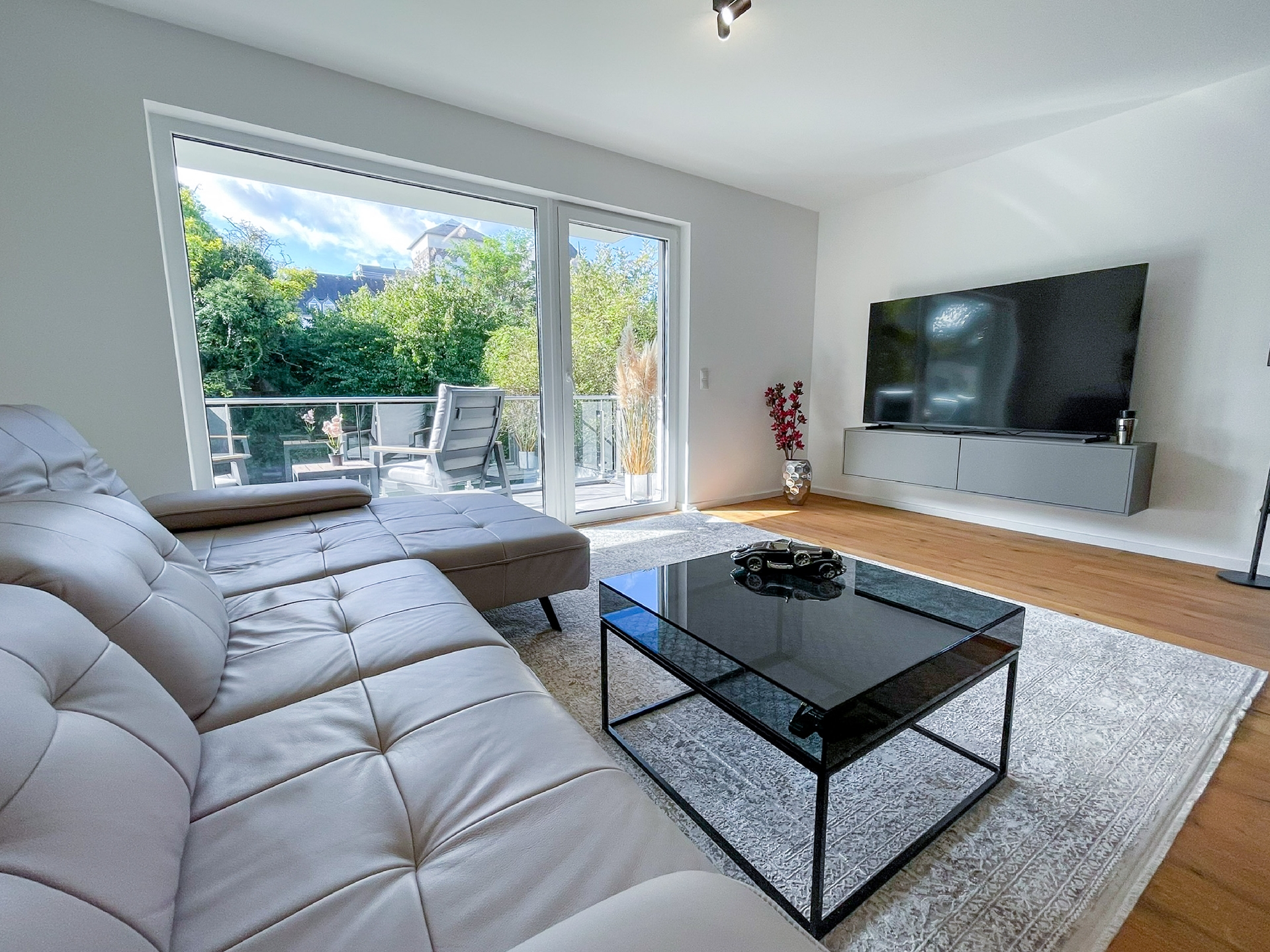 Der großzügige Wohn- und Essbereich mit maßgefertigter Einbauküche ist das Herzstück der Wohnung und bietet direkten Zugang zu einem der beiden Balkone  ideal, um den Blick ins Grüne und die ruhige Umgebung zu genießen. Das Schlafzimmer überzeugt ebenfalls mit Balkonzugang und herrlichem Ausblick. Ein weiteres Zimmer eignet sich perfekt als Kinder-, Gäste- oder Arbeitszimmer.