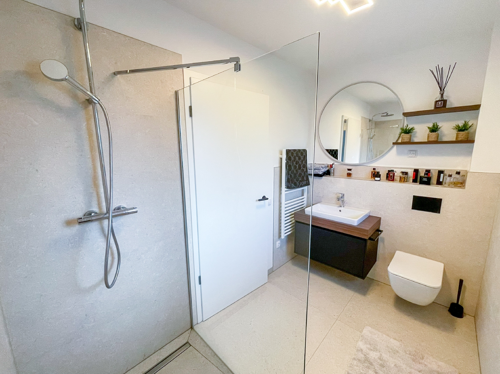 Dank Luft-Wasser-Wärmepumpe und Fußbodenheizung wohnen Sie nicht nur komfortabel, sondern auch nachhaltig. Dreifach verglaste Fenster mit elektrischen Beschattungen unterstreichen den modernen Standard.