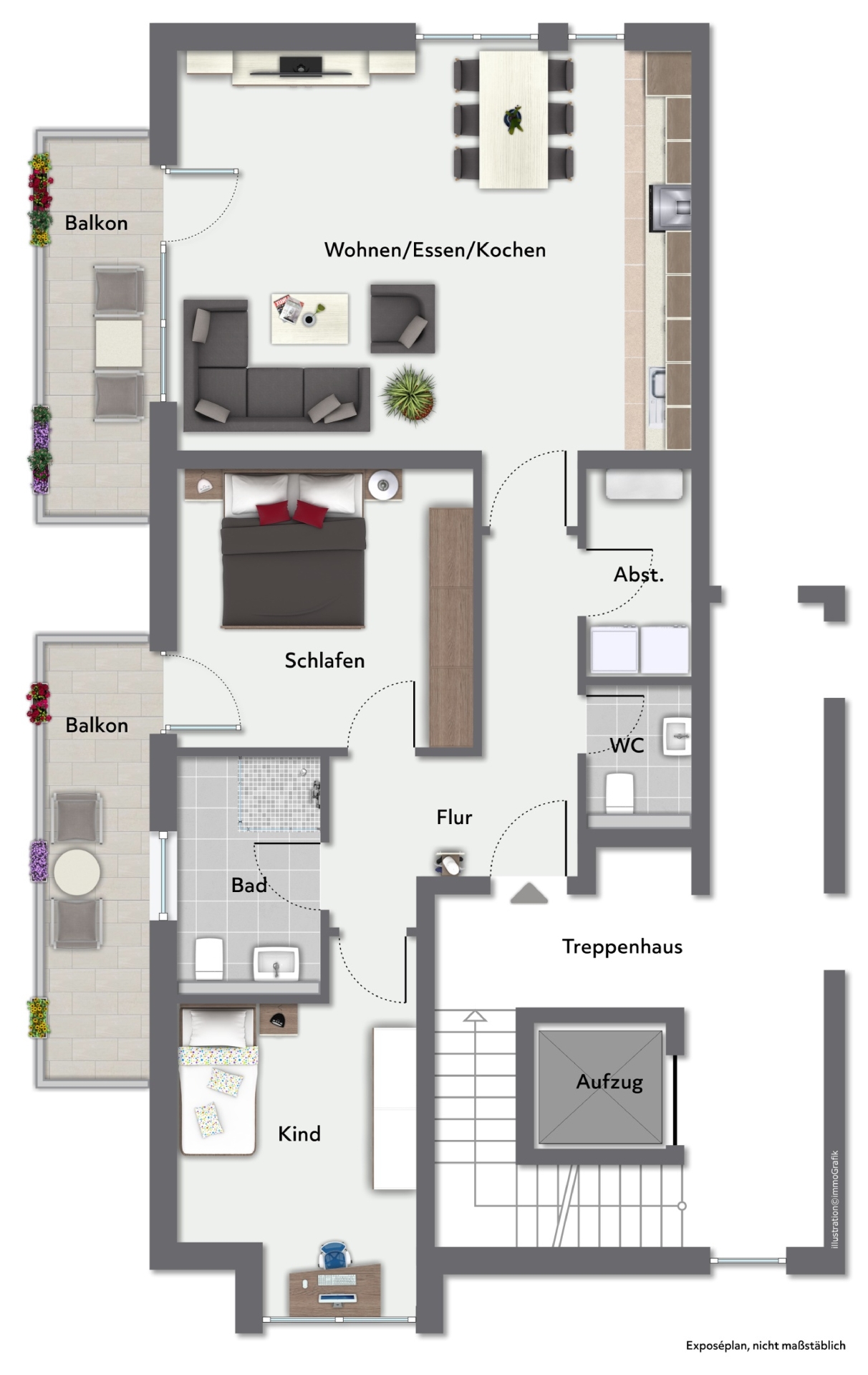 Über den Aufzug gelangen Sie bequem und barrierefrei in die Wohnung. Bodentiefe Fenster durchfluten alle Räume mit Tageslicht und schaffen eine offene, freundliche Atmosphäre.