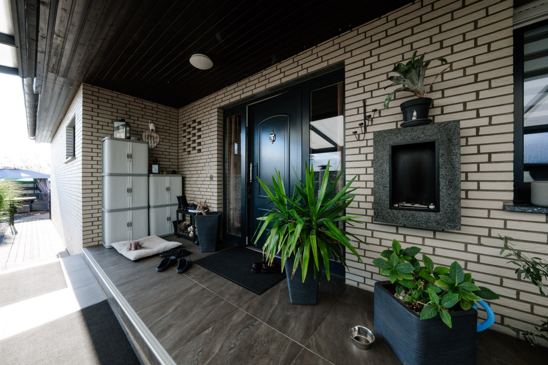 – Einfahrt mit überdachtem Vorbereich zum Haus – Komfort bis zur Haustür.