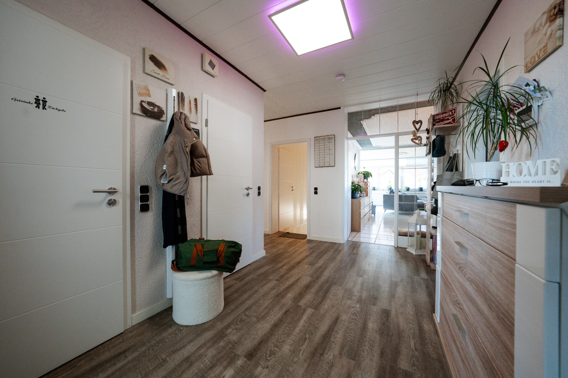 Hier beginnt jeder Tag mit einem Lächeln. In diesem liebevoll modernisierten Bungalow aus dem Jahr 1978 verschmelzen Licht, Raum und Wärme zu einem Ort, an dem sich die ganze Familie wohlfühlen kann. 142 m² Wohnfläche offenbaren helle, einladende Zimmer, in denen Kinder spielen, Eltern arbeiten und gemeinsame Momente entstehen können.