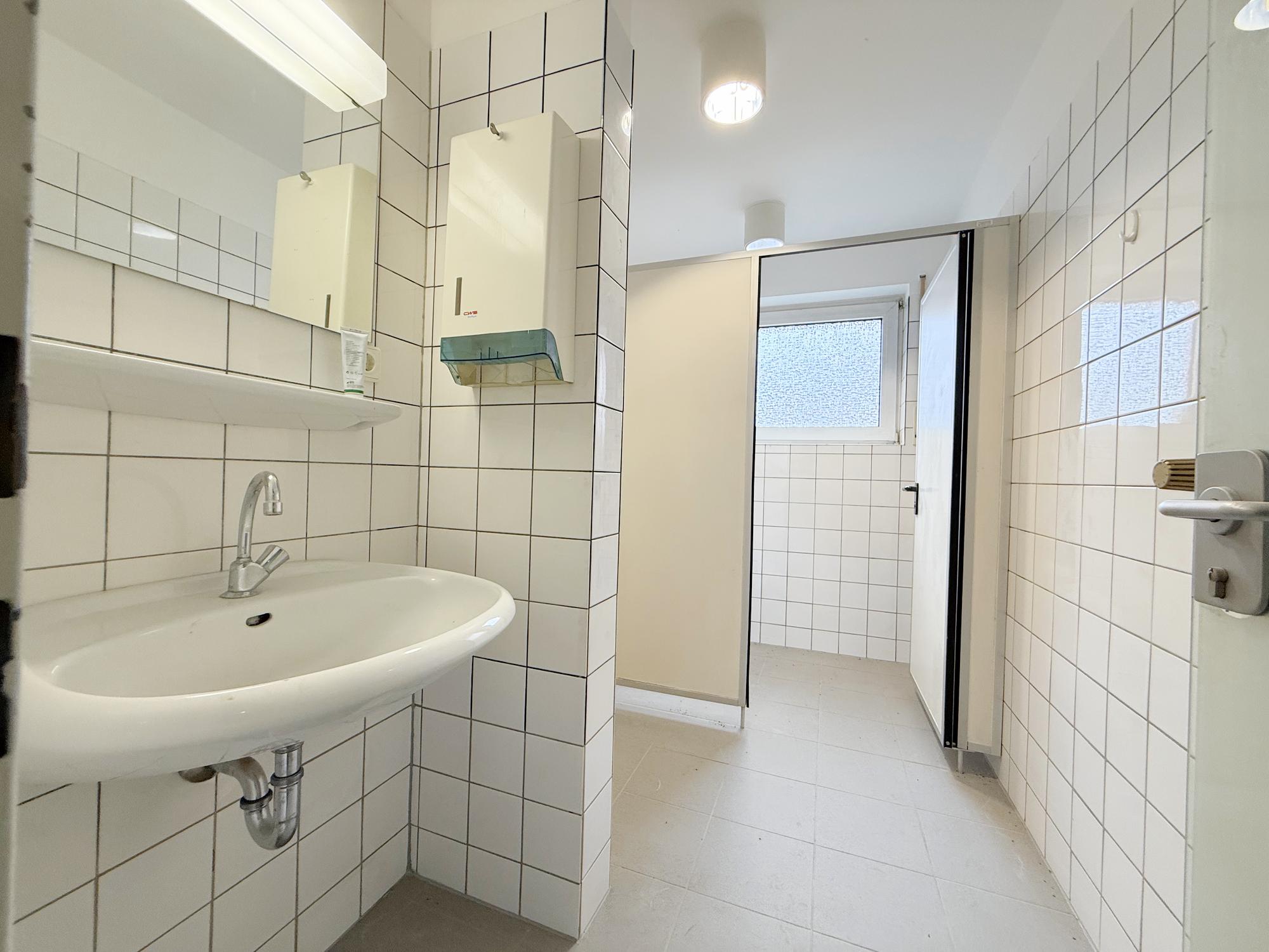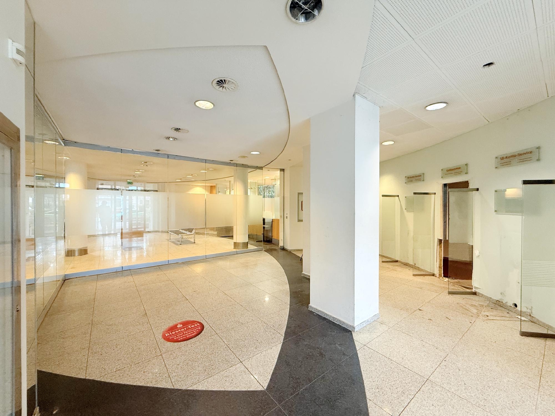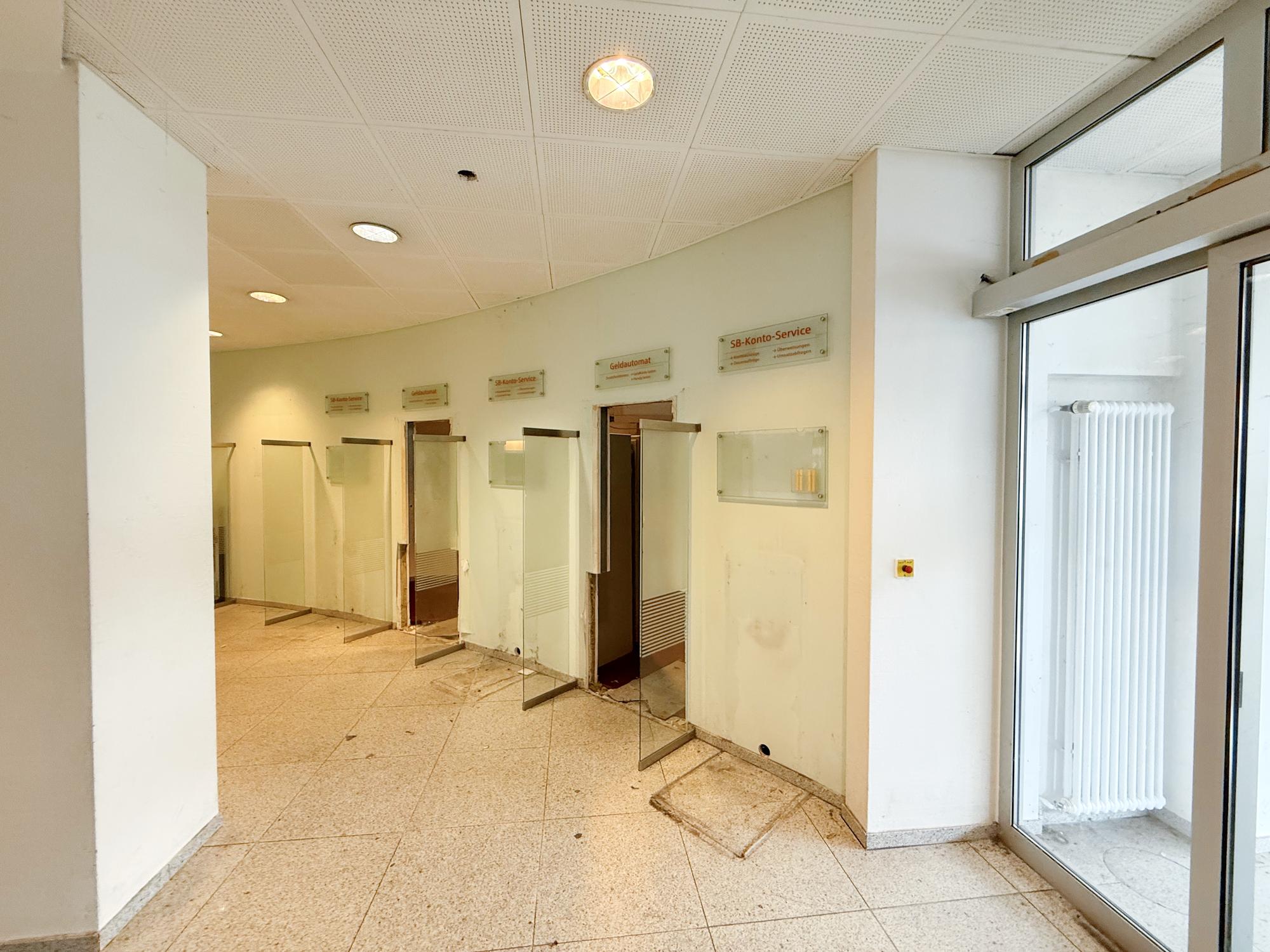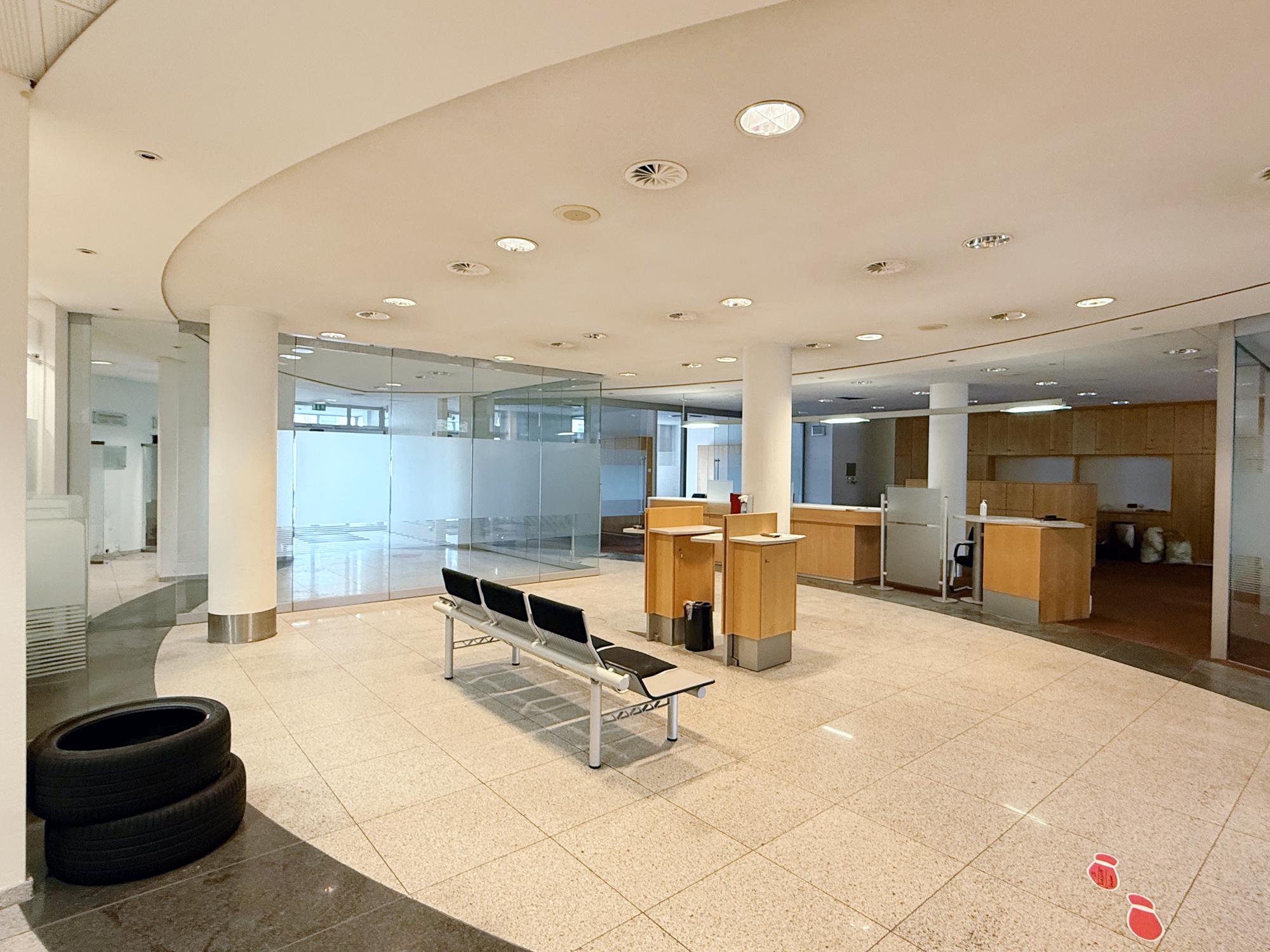 Diese großzügige, ehemals als Bankfiliale genutzte Einheit umfasst rund 440 m² und überzeugt mit einer klaren, kundenorientierten Raumstruktur. Der helle, nahezu ebenerdige Eingangsbereich öffnet sich zu einer weitläufigen Kundenhalle mit markantem Empfangs-/Schalterbereich und mehreren verglasten Beratungsboxen, die Diskretion bieten und zugleich Transparenz schaffen. Robuste Stein- bzw. Feinsteinzeugböden im Publikumsbereich, roter textiler Belag in den Büros sowie abgehängte Lochrasterdecken mit integrierten Einbauleuchten und sichtbaren Auslässen der Raumlufttechnik prägen den professionellen Gesamteindruck. Rückwärtig gliedert sich die Fläche in funktionale Back-Office-Zonen, ruhige Einzel- und Teamräume, Besprechungszimmer sowie Archiv- und Technikflächen; eine interne Treppe bindet zusätzliche Nebenbereiche an und sorgt für kurze Wege im Arbeitsalltag. Die Sanitärbereiche sind hell gefliest, teilweise tagesbelichtet und getrennt angeordnet. Großzügige Fensterfronten bringen viel Tageslicht in die Räume, klassische Heizkörper sorgen für eine zuverlässige Beheizung. Frühere SB-Zonen der Bank – etwa Konto-/Servicebereiche – sind noch vorhanden und lassen sich je nach Bedarf weiterverwenden oder rückbauen. Insgesamt präsentiert sich das Objekt in solidem, stellenweise modernisierungsbedürftigem Zustand und bietet damit hervorragende Voraussetzungen für eine zügige Inbetriebnahme bei gleichzeitig hoher Gestaltungsfreiheit. Ob Beratung, Kanzlei, Agentur, Praxis/Therapie, Bildung oder Showroom mit Empfang – die überwiegend leichten Trennwände und die großzügigen Sichtachsen erlauben flexible Umbauten bis hin zu offenen Teamflächen oder zusätzlichen Meeting- und Schulungsräumen. Eine repräsentative Adresse mit viel Potenzial für moderne Dienstleistungs- und Büronutzungen.