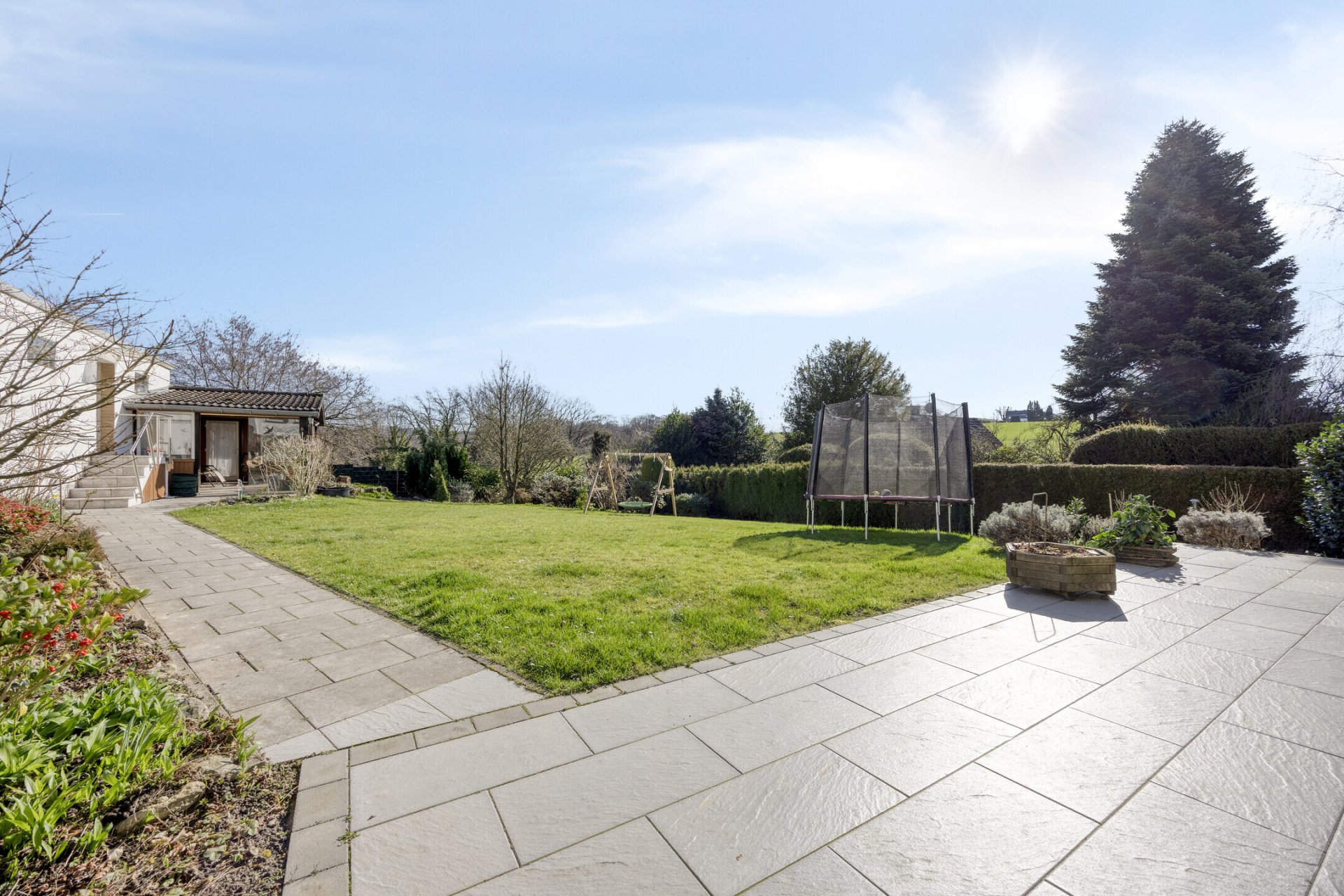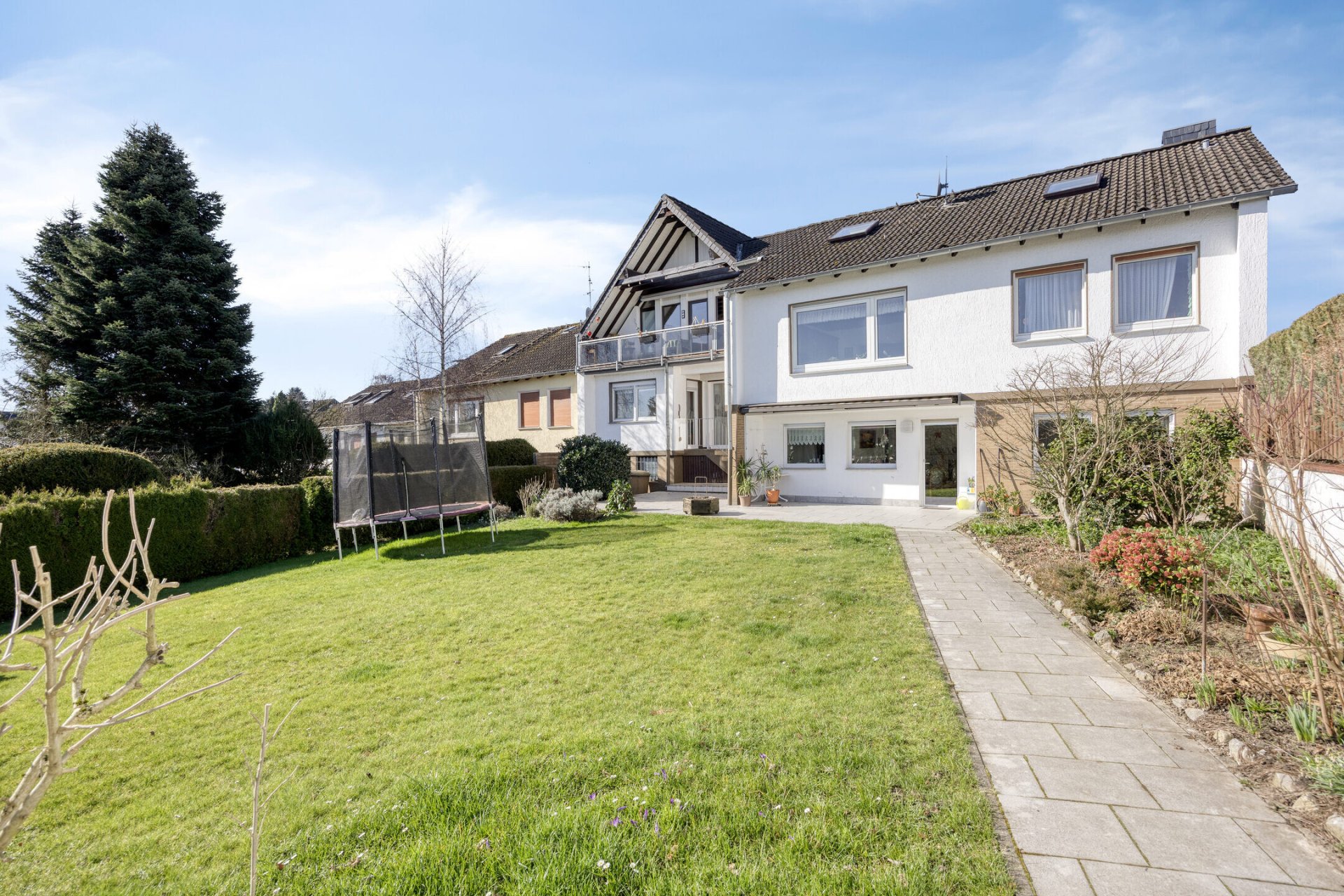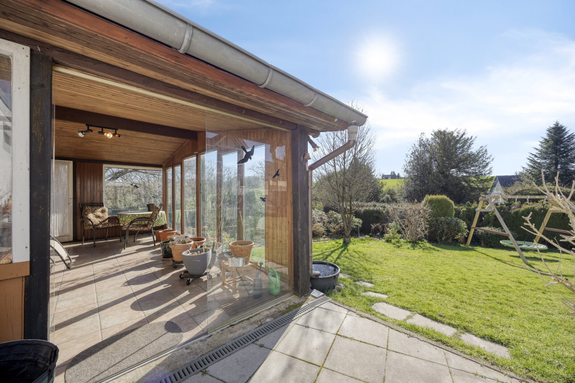 Der Garten bildet das grüne Herzstück der Immobilie und bietet viel Platz für Freizeit, Spiel und Erholung. Terrasse und Wintergarten schaffen zusätzliche Aufenthaltsbereiche und ermöglichen schöne Stunden mit Blick ins Grüne.
