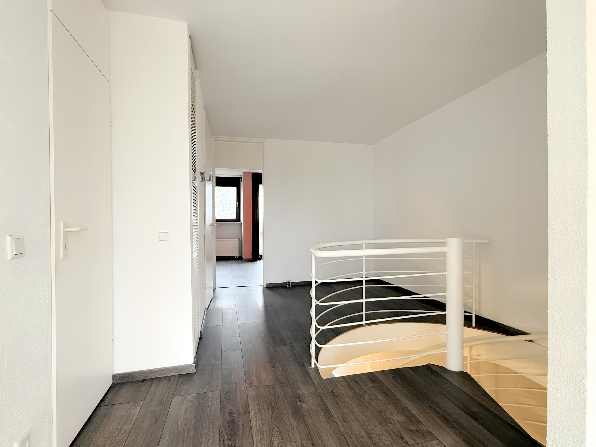 Beim Betreten der hellen Wohnung mit Blick ins Grüne empfängt Sie ein praktischer Eingangsbereich, welcher sich in den großzügigen Wohnraum öffnet. Von hier aus gelangen Sie durch eine kleine Garderobe in das Gäste-WC sowie auf direktem Wege in die Küche. Der gut geschnittene Wohnraum bietet die Möglichkeit einen Wohn- und einen Essbereich einzurichten. Ein Balkon mit Südausrichtung rundet die Ebene ab. Über eine offene Wendeltreppe gelangen Sie in die obere Ebene. Hier befinden sich das Schlafzimmer, ein großer offener Raum, welcher mit wenig Aufwand abgetrennt werden kann, das Wannenbad und ein WC. Beide Räume verfügen über jeweils einen eigenen Balkon.