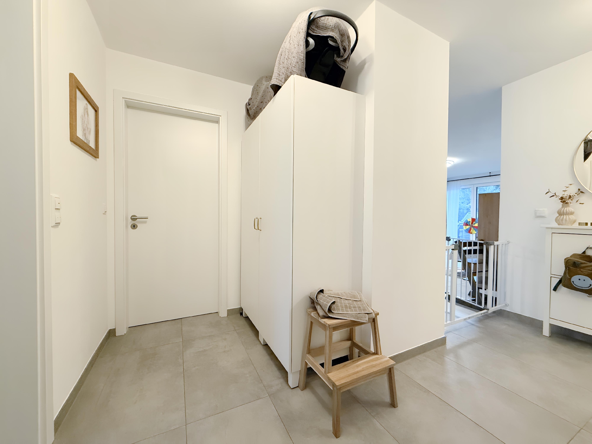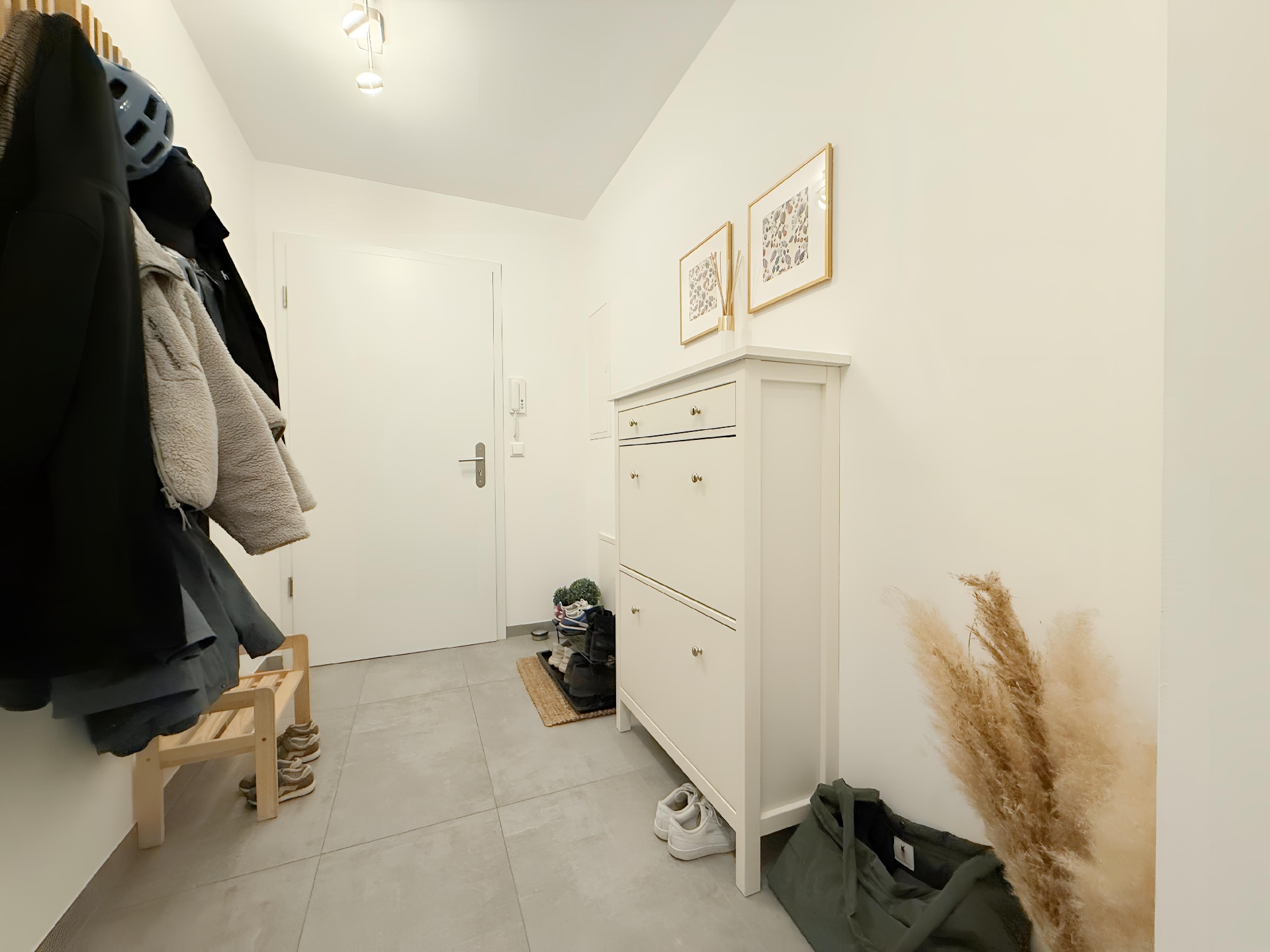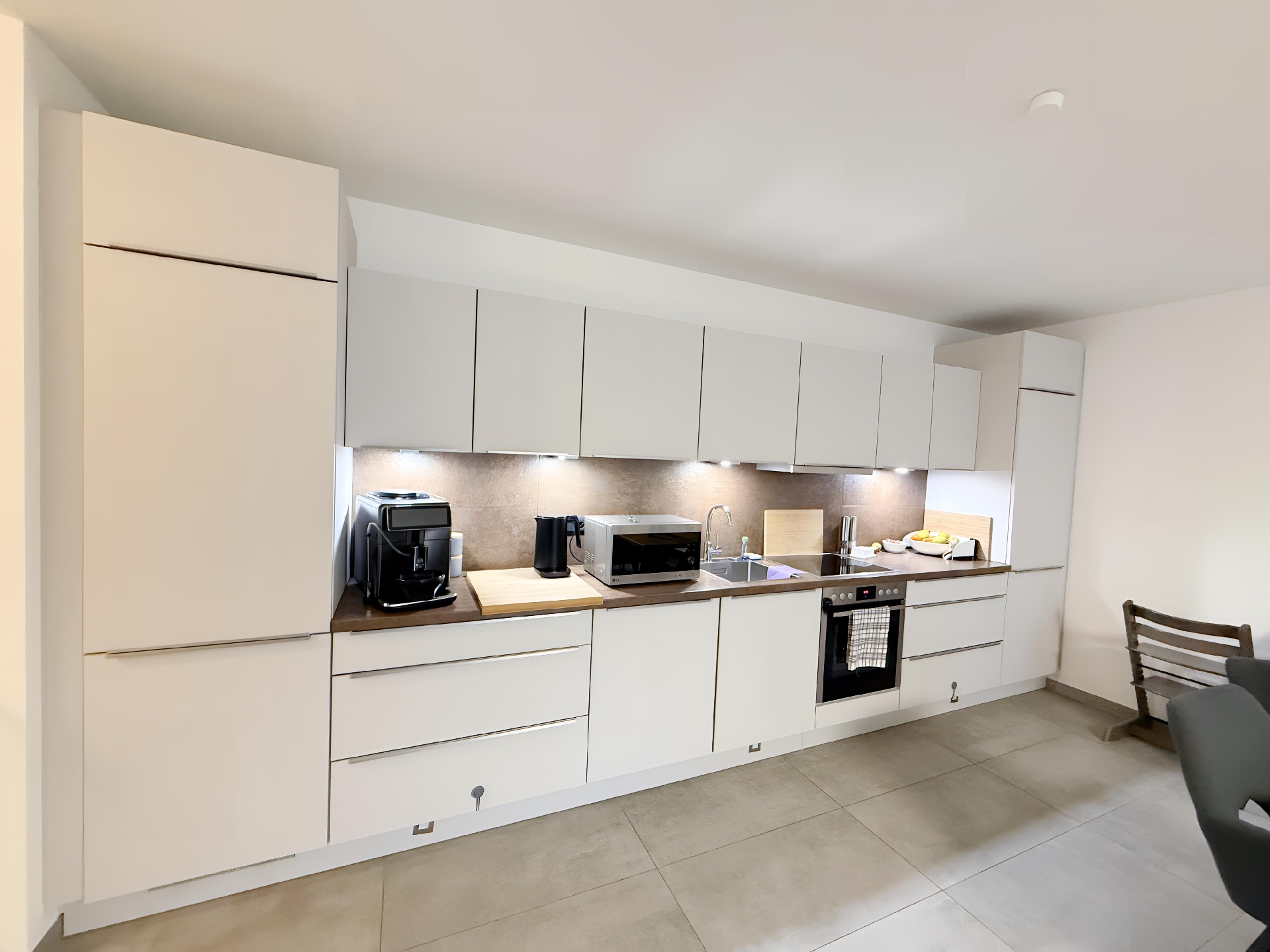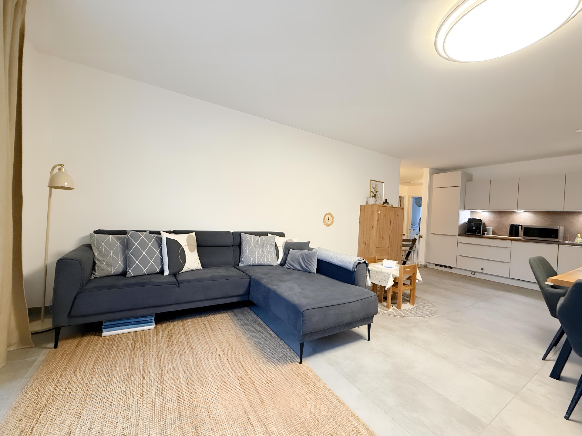 Die Wohnung bietet eine moderne, gepflegte Ausstattung: großformatige Feinsteinzeugböden, Fußbodenheizung und breite Fensterflächen für viel Licht. Das Bad ist hochwertig mit bodengleicher Dusche und Wanne, zusätzlich gibt es ein Gäste-WC. Vor Einzug werden alle Wände frisch weiß gestrichen. Draußen überzeugt eine großzügige Terrasse mit Rasenanteil. Zur Wohnung gehören außerdem eine Garage sowie ein Abstellraum im Dachgeschoss; die vorhandene Einbauküche verbleibt nicht.