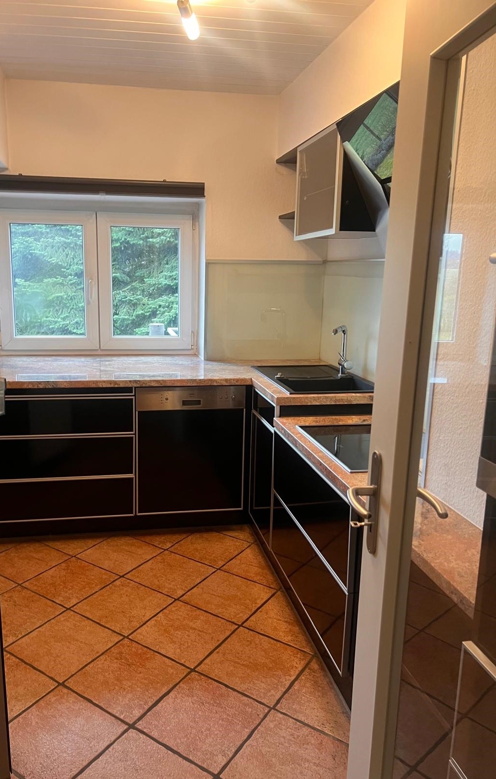 Die Küche ist zur Zeit ausgestattet u.a.mit Herd, Spülmaschine und einem Ofen in Arbeitshöhe.