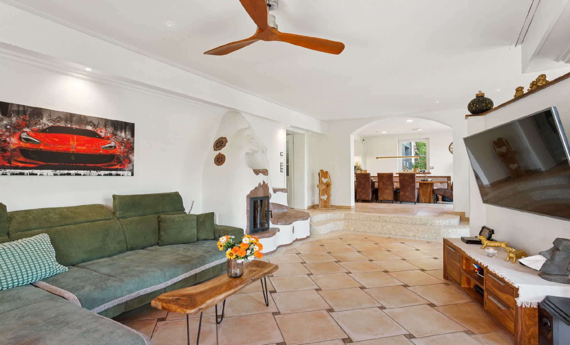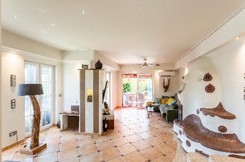 Ein stilvoller Kachelofen sorgt für behagliche Wärme, während integrierte Lichtspots, drei Klimaanlagen sowie eine moderne Fußbodenheizung über Wärmepumpe für zeitgemäßen Wohnkomfort sorgen. Zwei Stufen trennen den Essbereich elegant vom Wohnzimmer.