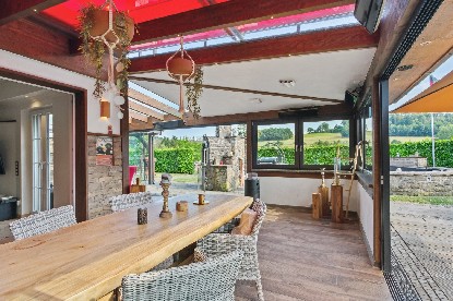 Aus dem Wohnbereich gelangen Sie in den angrenzenden Warmwintergarten mit isolierter Bodenplatte, Heizstrahlern, elektrischen Aufdachmarkisen und Blick in den liebevoll gestalteten Garten. Hier lässt es sich das ganze Jahr über entspannen.