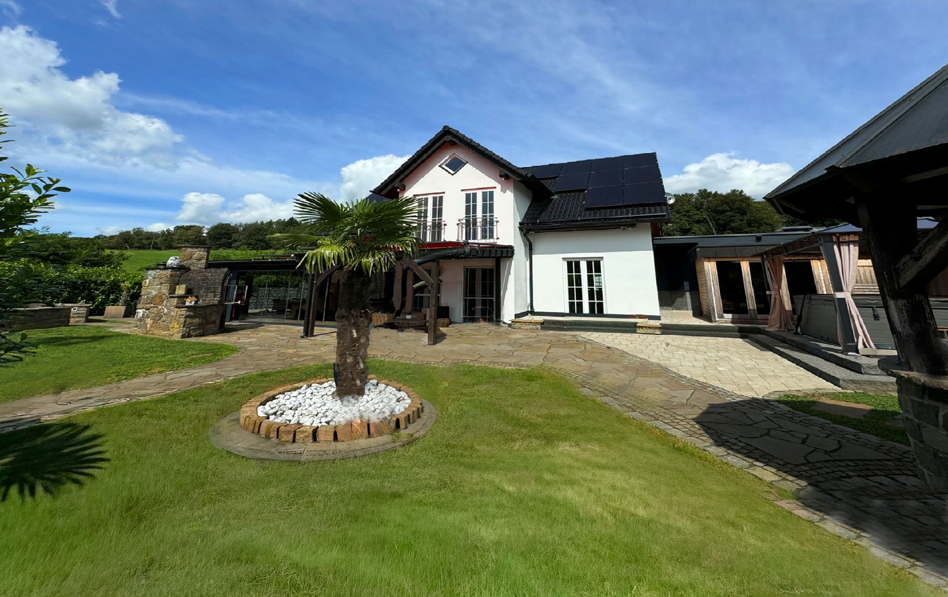 Der Außenbereich begeistert mit einer großzügigen Bangkirai-Terrasse, einem überdachten Whirlpool, einer Außensauna mit Vorraum sowie einem großen Pizzaofen. Ein gemütlicher Rundsitzplatz lädt zum Verweilen mit Familie und Freunden ein. Das Gartenhaus bietet zusätzlichen Stauraum.