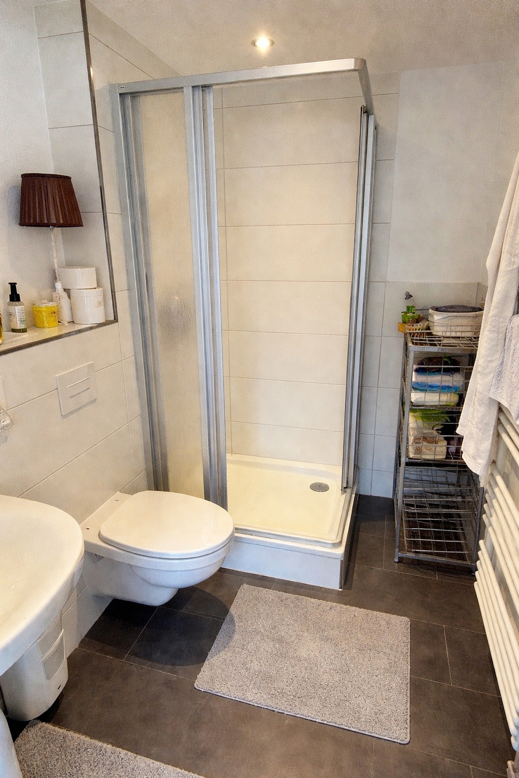 Das Bad ist mit pflegeleichten Fliesen auf Boden ausgestattet und verfügt über eine Dusche, einen Waschtisch sowie ein WC. Ein praktischer Anschluss für eine Waschmaschine ist direkt in der Wohnung vorhanden. Der Wohnbereich ist mit Vinylboden ausgelegt.