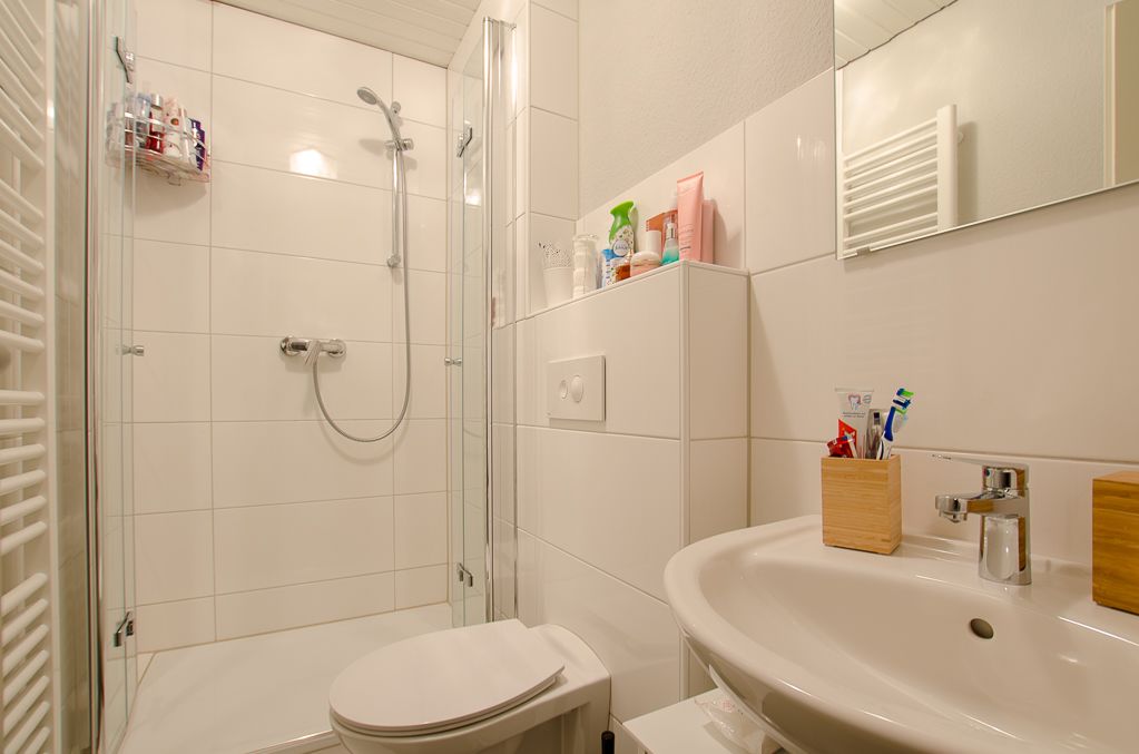 In der unteren Etage befinden sich das neu erstellte Bad mit Dusche sowie die Küche und der Treppenaufgang zur oberen Etage.
