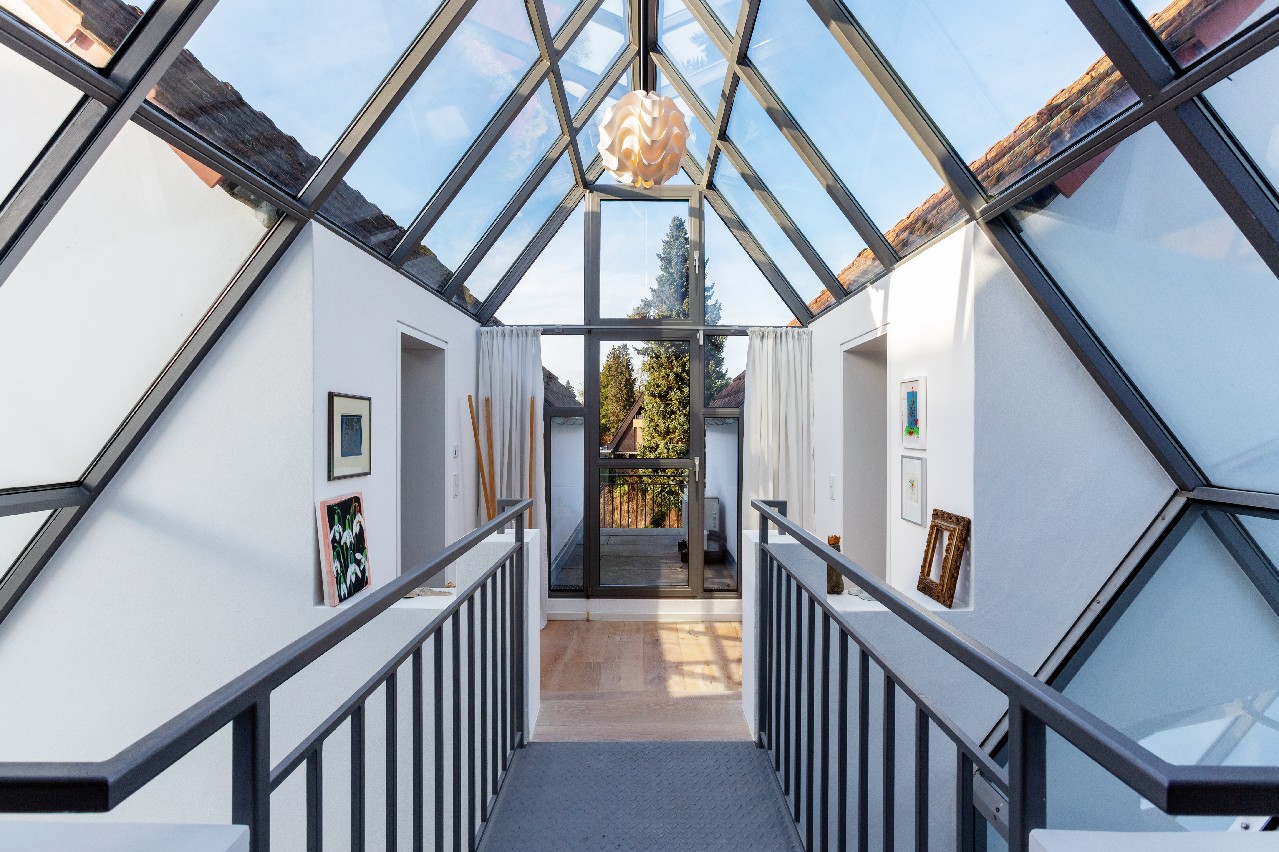 Architektonisch verbindet die Immobilie das Beste aus zwei Welten: Der ursprüngliche Charakter des Hauses bleibt spürbar gleichzeitig wird er durch einen lichtdurchfluteten Glastrakt modern interpretiert.