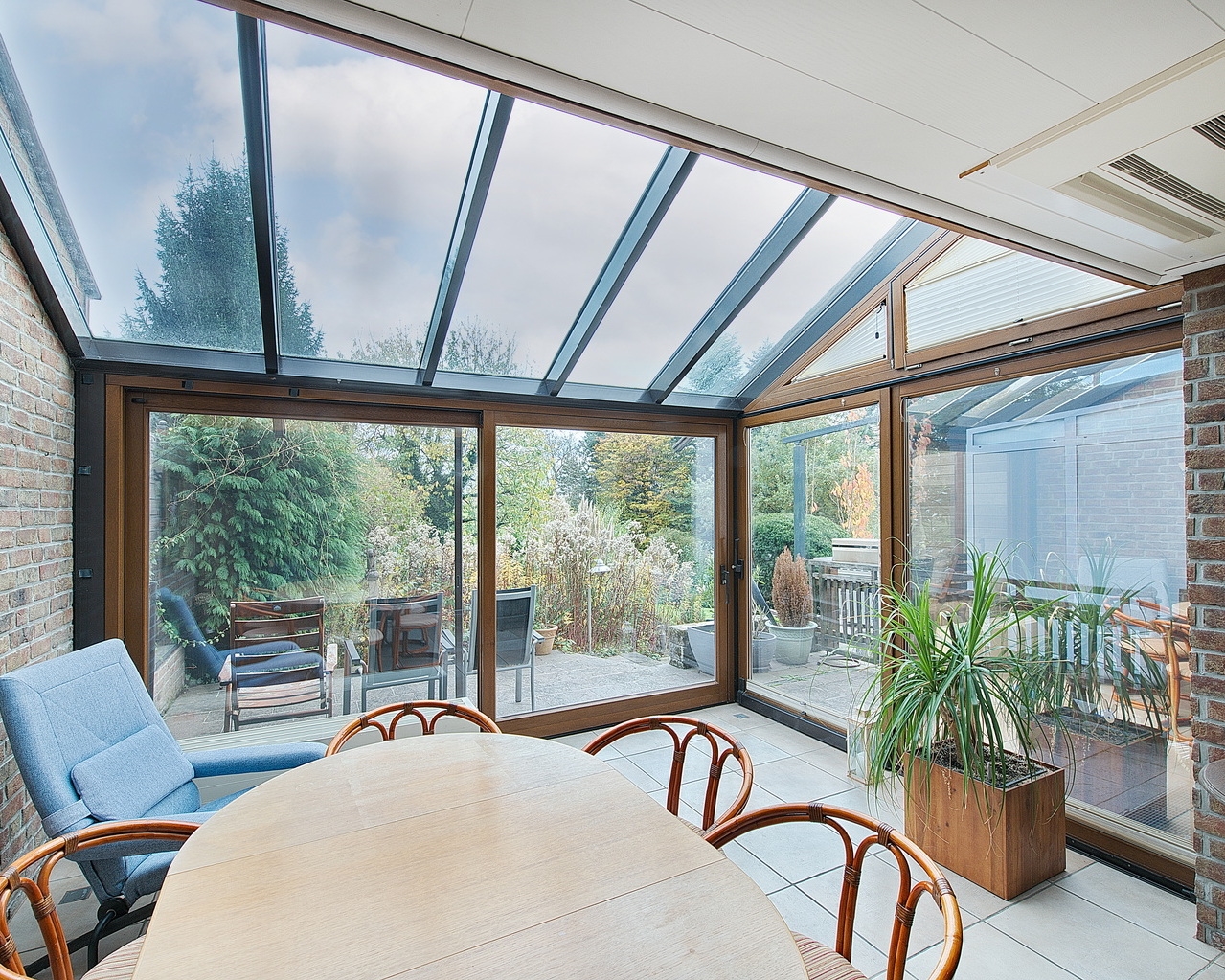 Im klassisch aufgeteilten Erdgeschoss befinden sich Küche, Gäste-WC sowie das geräumige Wohn-Esszimmer, das im Jahr 2006 um einen Wintergarten erweitert wurde. Dieser bietet Zugang zur angrenzenden Terrasse und zum südlich ausgerichteten Garten. An kalten Winterabenden sorgt ein Kamin im Wohnbereich für eine behagliche Atmosphäre.