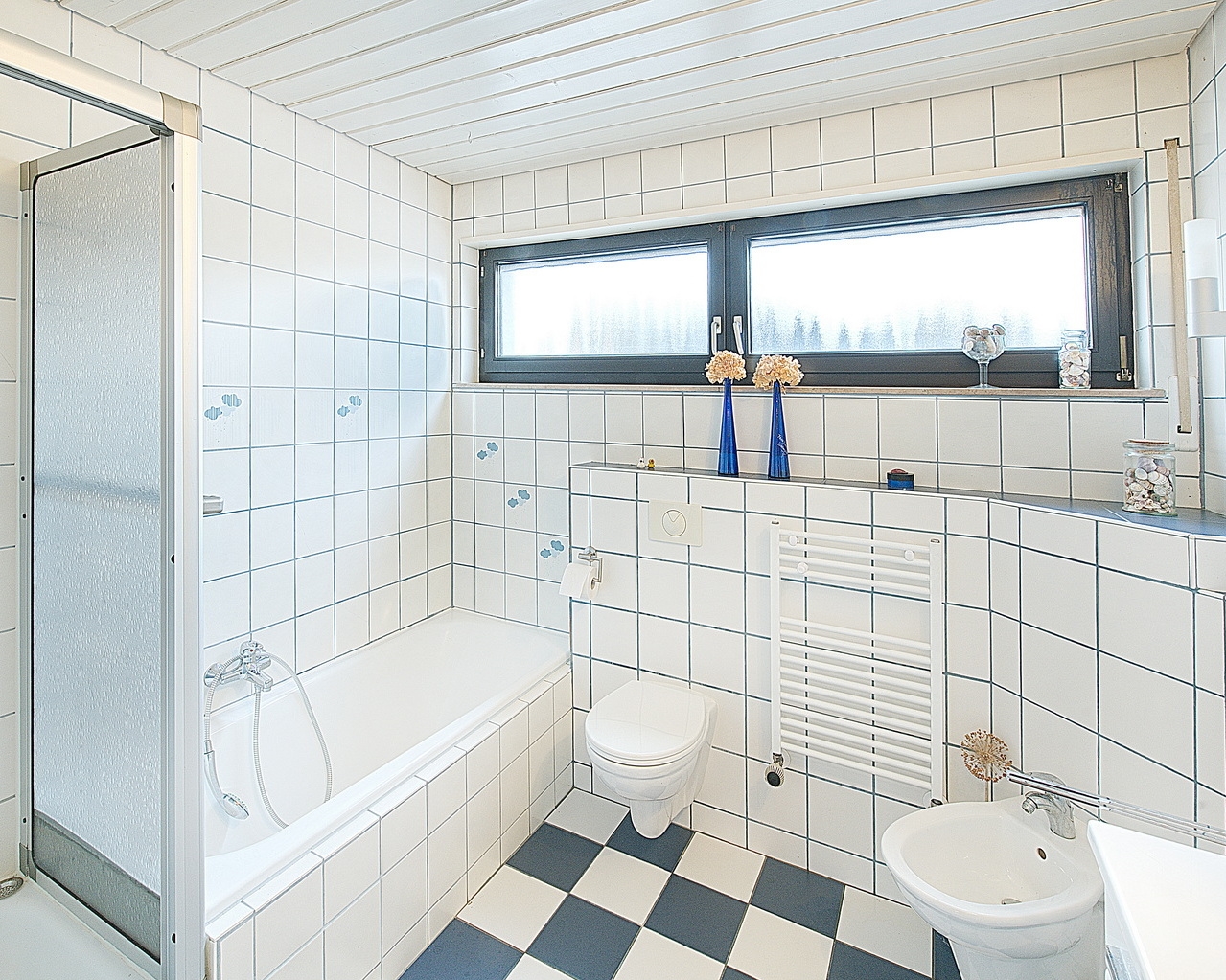 - Badausstattung: Dusche, Badewanne, Fenster im Badezimmer