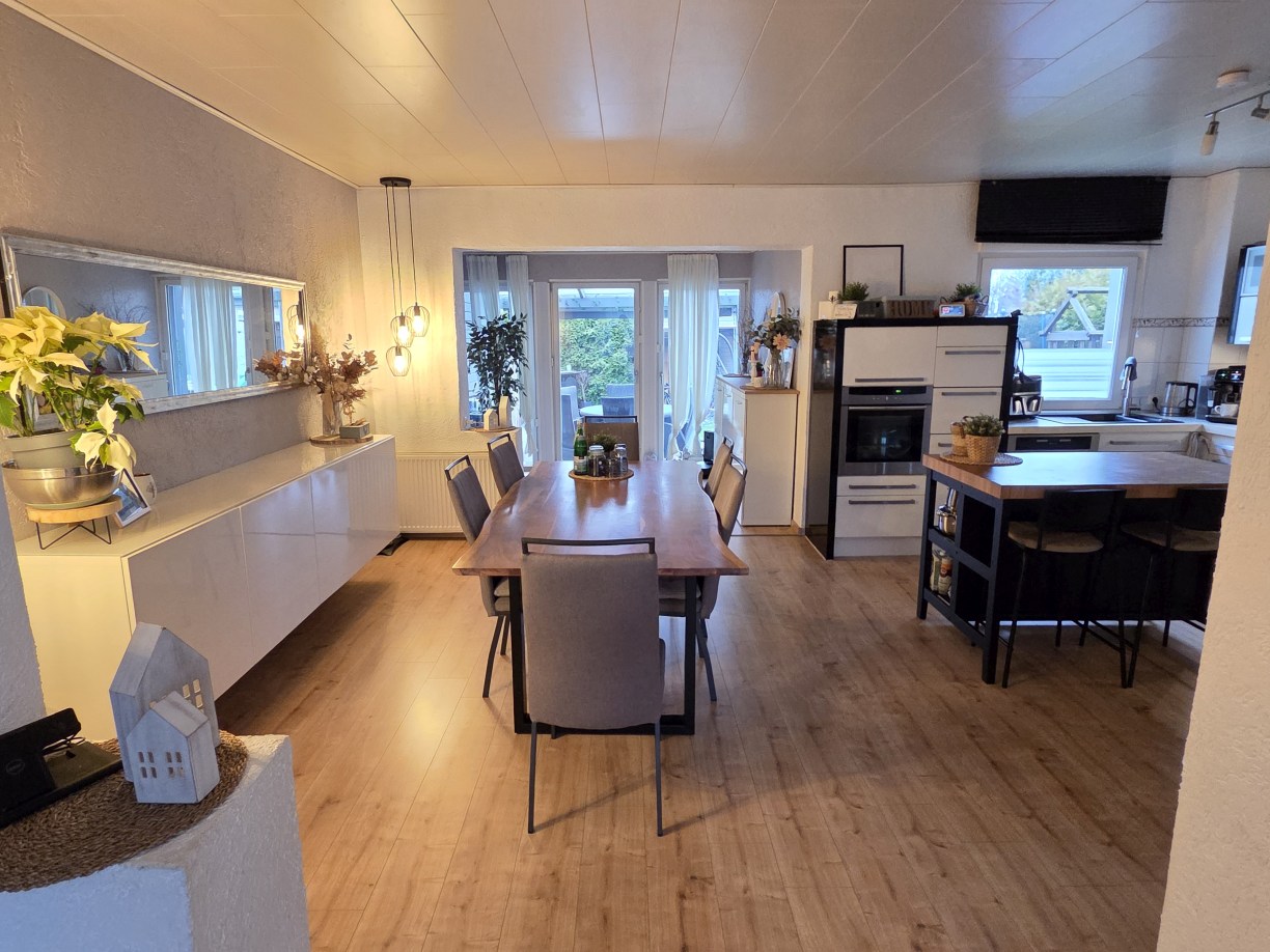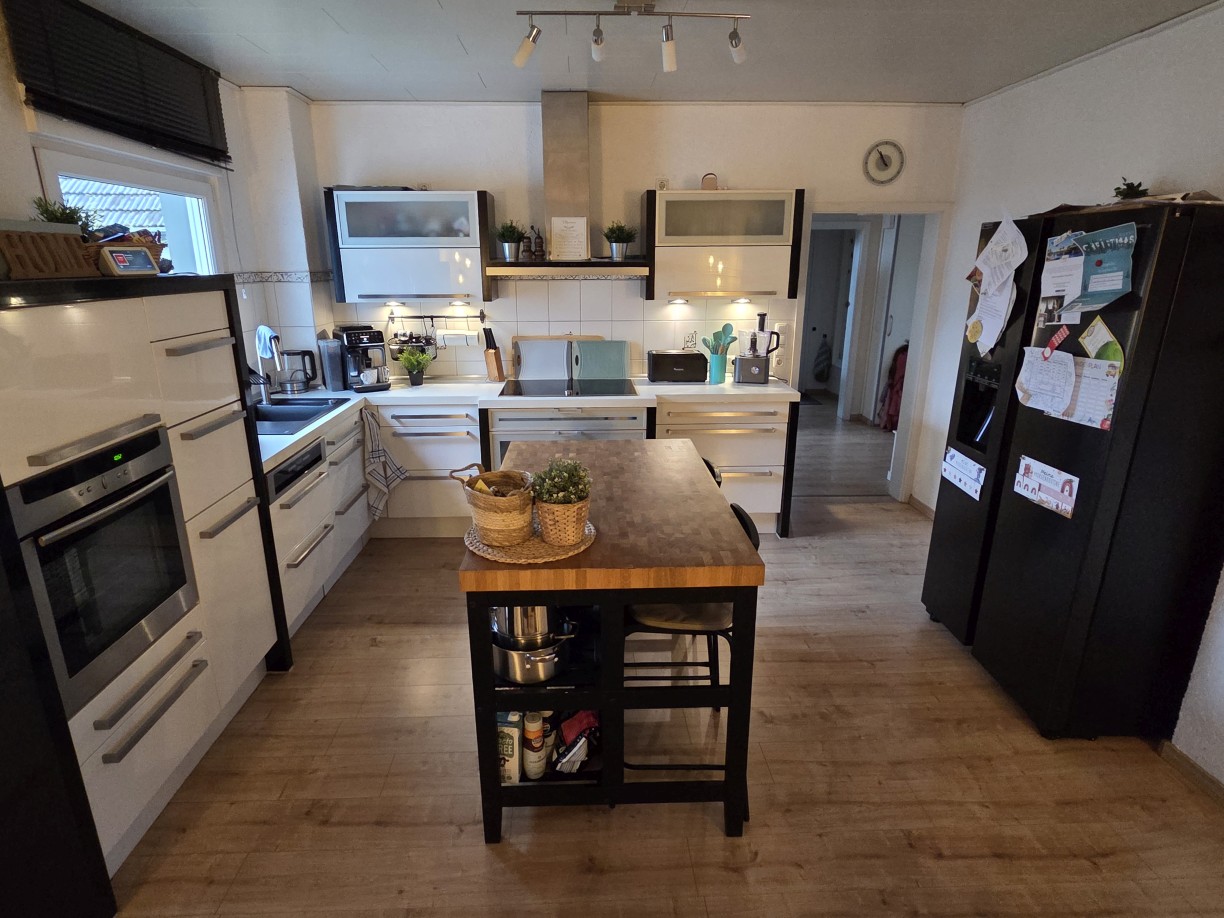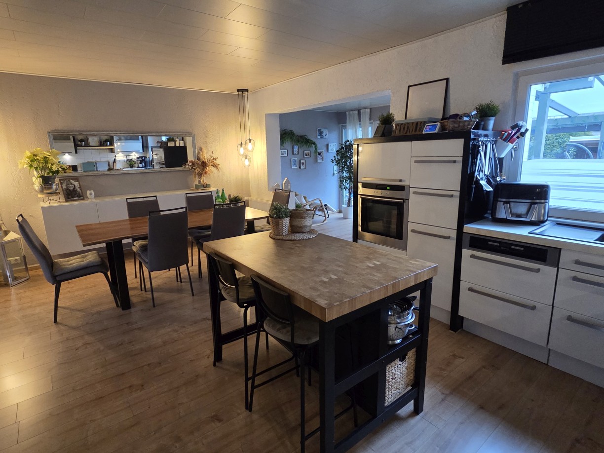 Einfamilienhaus aus 1955, von innen komplett modernisiert, großzügige Raumaufteilung mit satten 198 m² Wohnfläche zzgl. ca. 76 m² Nutzfläche im Untergeschoss, Massivbauweise, 1 1/2-geschossig mit zusätzlich ausgebautem Spitzboden. Insgesamt 5 Schlafräume plus Gäste-Zimmer im UG, großzügige, offene Küche und Wohnbereich mit insgesamt ca. 61 m² – EBK bereits im Kaufpreis enthalten.