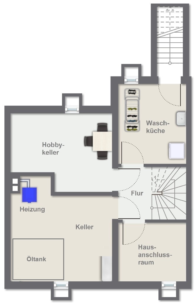 Als zusätzliche Flächen sind im Keller ein Hausanschlussraum, eine Waschküche mit Gartenausgang sowie zwei klassische Kellerräume mit Nutzflächen von ca. 15 m² und ca. 11 m² vorhanden.