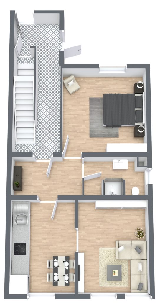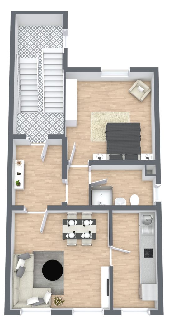 Aktuell befinden sich in dem Mehrfamilienhaus drei vermietete Wohnungen (Erd-, 1.- und 2. Obergeschoss). Im Dachgeschoss könnte vermutlich eine vierte Einheit geschaffen werden – dies ist jedoch mit dem zuständigen Bauordnungsamt der Stadt Bad Honnef abzustimmen. Das in wohnraumähnlicher Qualität ausgebaute Dachgeschoss dient derzeit als Hobbyraum.