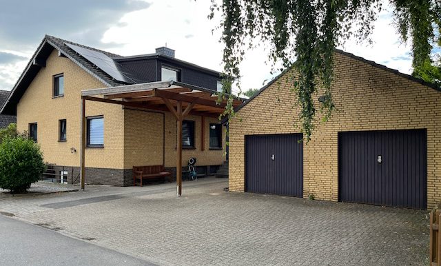 Eine große Doppelgarage ergänzt das Angebot und bietet ausreichend Platz für Fahrzeuge und zusätzliche Lagerflächen. Das Carport ist speziell darauf ausgelegt, ein großes Wohnmobil sicher unterzubringen.