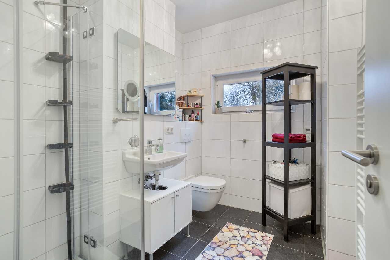 - Badausstattung: Dusche, Badewanne, Fenster im Badezimmer