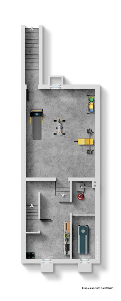 Ein weiterer Vorteil ist die Vollunterkellerung, die zusätzlichen Stauraum bietet. Die überdachte Terrasse eröffnet den Blick auf den pflegeleichten Garten, der mit einer Garage bebaut ist. Hier finden Sie ausreichend Abstellmöglichkeiten für Gartenutensilien und Fahrräder.