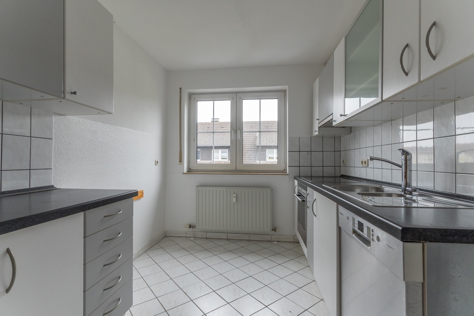 Neben dem Wohn-/ und Essbereich befindet sich das Schlafzimmer, das ebenfalls mit einem neuen Vinylboden ausgestattet wird. Gleiches gilt für das danebenliegende Kinder-/, Gäste-/ oder Arbeitszimmer, das flexibel genutzt werden kann. Rechts daneben liegt das moderne Tageslichtbad mit Dusche und Badewanne. Direkt anschließend befindet sich die Küche, in der eine Einbauküche vorhanden ist, die zur kostenfreien Nutzung zur Verfügung gestellt wird.