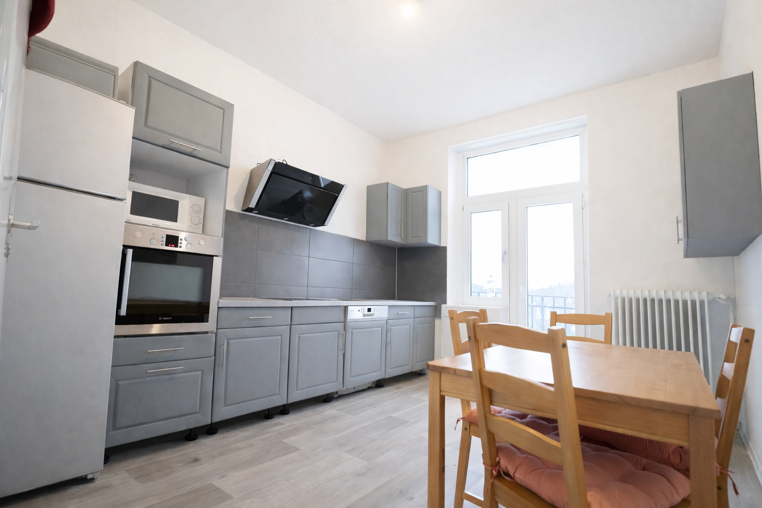 Gegenüber des Wohnzimmers befindet sich die Küche mit ausreichend Fläche für eine Küchenzeile und einen Essbereich. Direkt nebenan liegt das Tageslichtbad, das mit modernen Fliesen, einer Badewanne sowie einem Waschmaschinenanschluss ausgestattet ist.