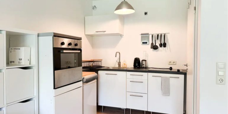 Die moderne Einbauküche ist kompakt, funktional und nahtlos in den Wohnraum integriert. Das frisch renovierte Badezimmer ist neu gestaltet und rundet das harmonische Gesamtbild auf ansprechende Weise ab.