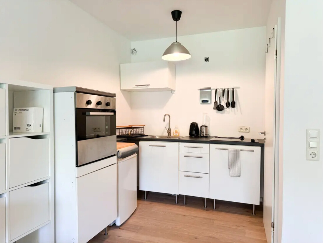 Die moderne Einbauküche ist kompakt, funktional und nahtlos in den Wohnraum integriert. Das frisch renovierte Badezimmer ist neu gestaltet und rundet das harmonische Gesamtbild auf ansprechende Weise ab.