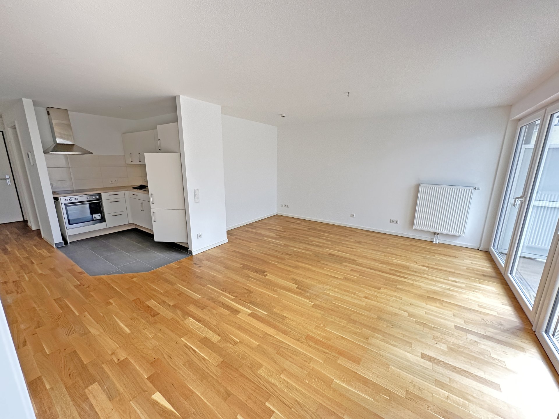 In einem terrassenförmig angelegten Haus, bieten wir Ihnen eine lichtdurchflutete gut geschnittene 2 Zimmer Wohnung mit Balkon. Diese verfügt über einen offenen Wohn-Küchenbereich ( mit Einbauküche ), ein Schlafzimmer mit Zugang zum Badezimmer und ein Gäste-WC. Die geräumige Diele und Abstellraum runden das Mietangebot ab. Die Bodenbeläge variieren zwischen Parkett und Fliesen.