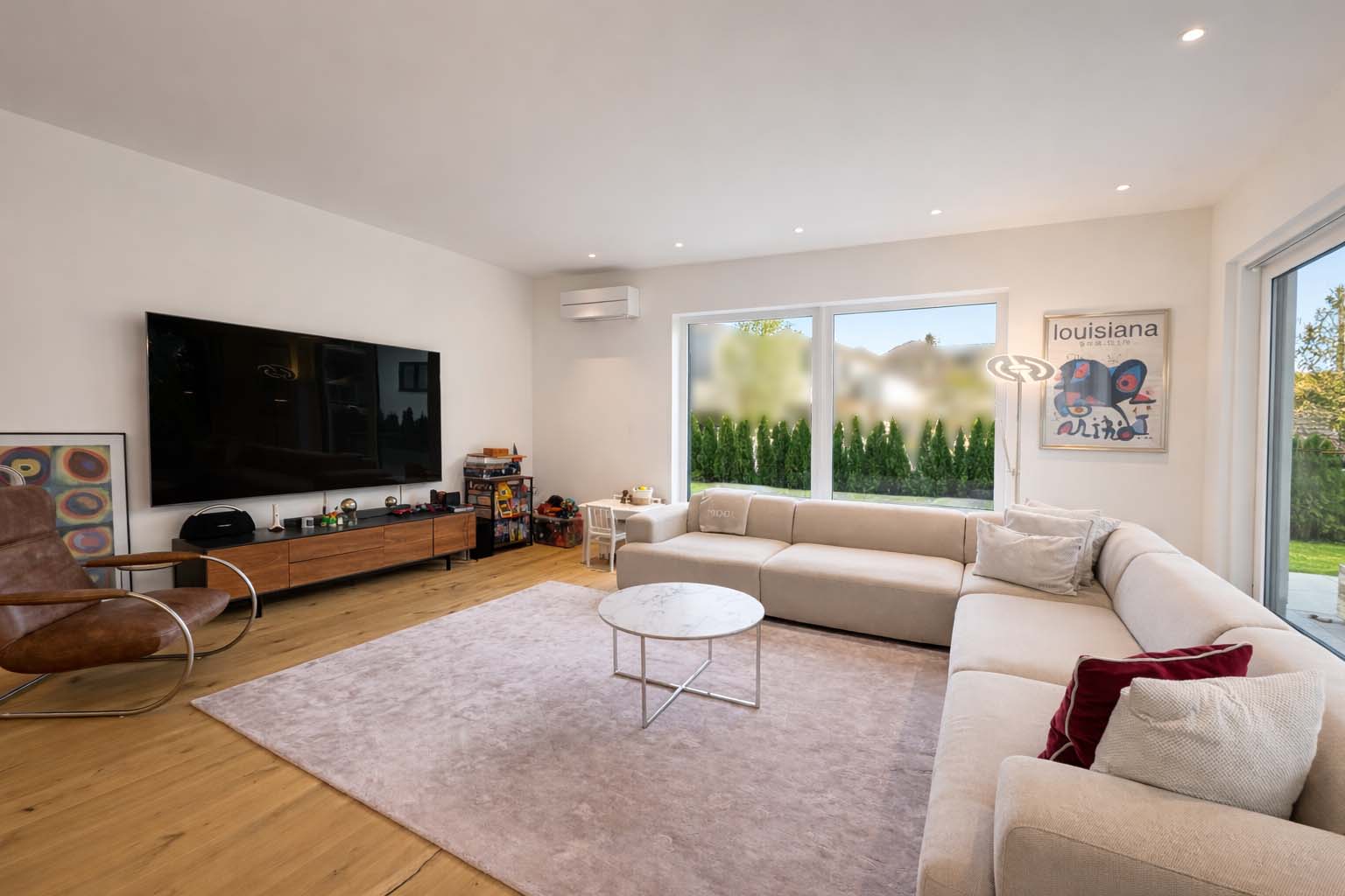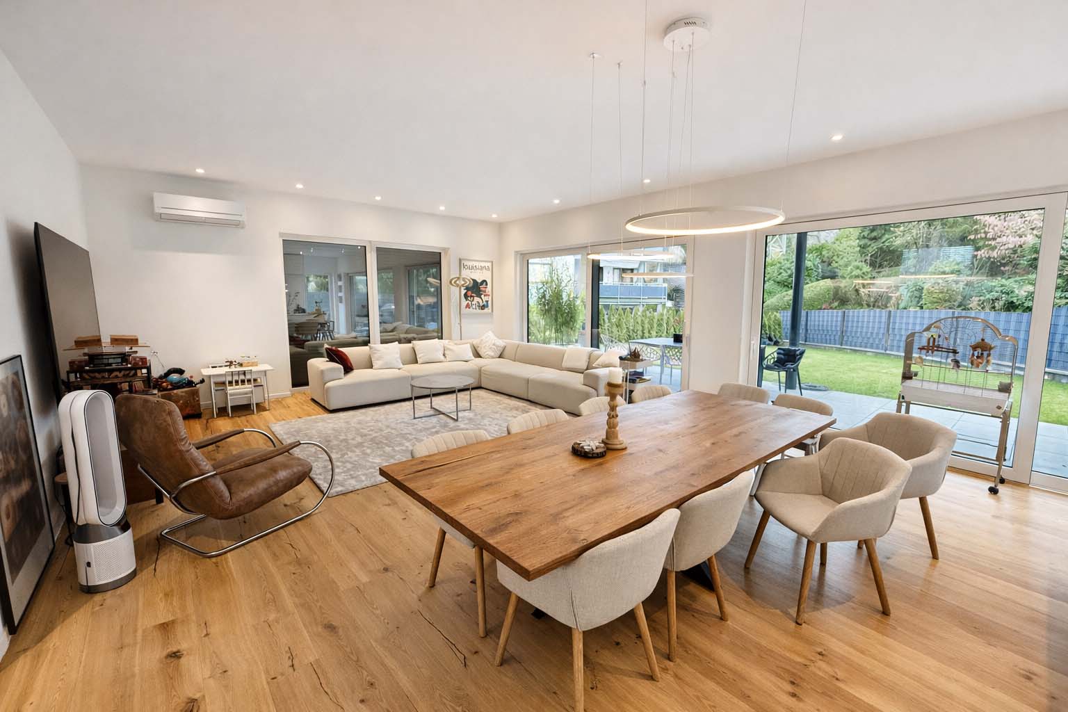 Der offen gestaltete Wohn- und Essbereich mit bodentiefen Fensterflächen schafft ein elegantes und zugleich behagliches Ambiente. Edles Kährs-Parkett, italienische Fiandre-Fliesen in Studio und Nasszellen sowie eine stilvolle Innen- und Außenbeleuchtung von Bega unterstreichen den gehobenen Anspruch. Die maßgefertigte Küche mit Miele-Geräten, Bora-Kochfeld und Quooker-System wird durch eine hochwertige Garderobe und Ankleide von Steeg Wohnconcept ergänzt.