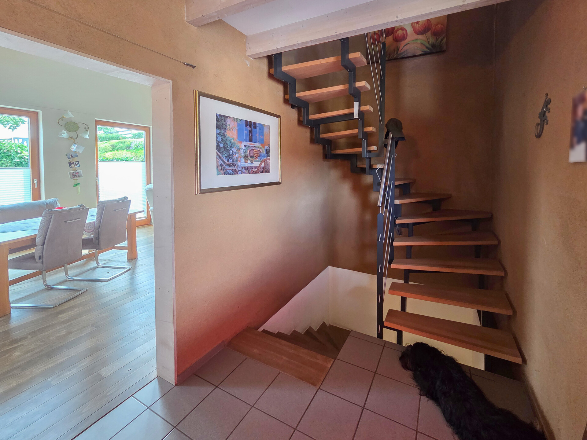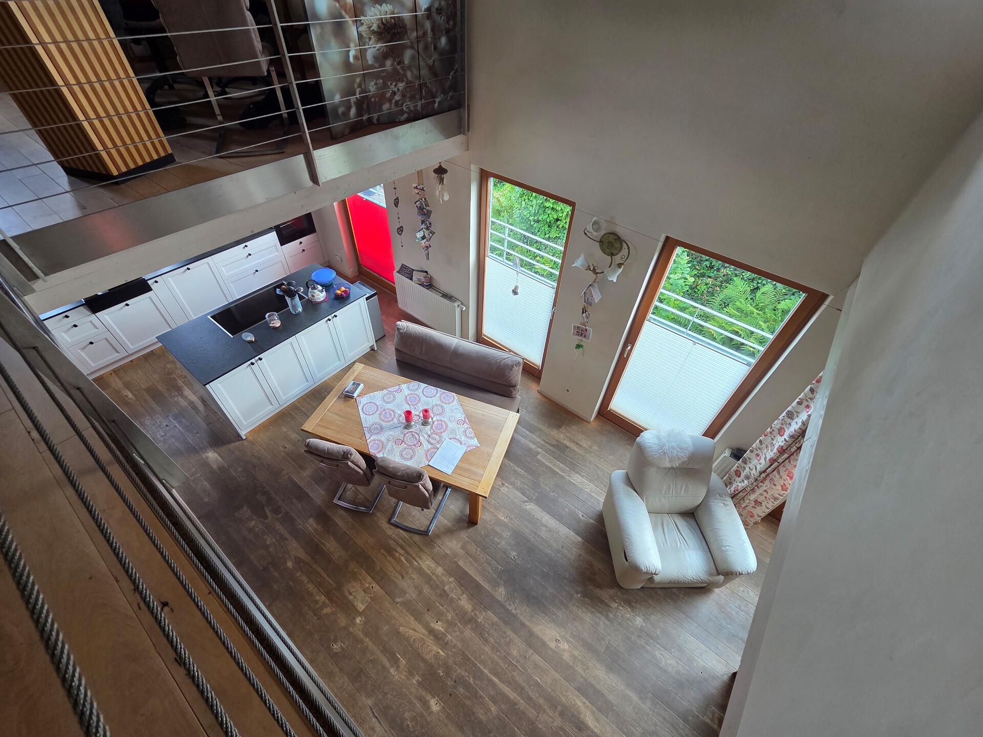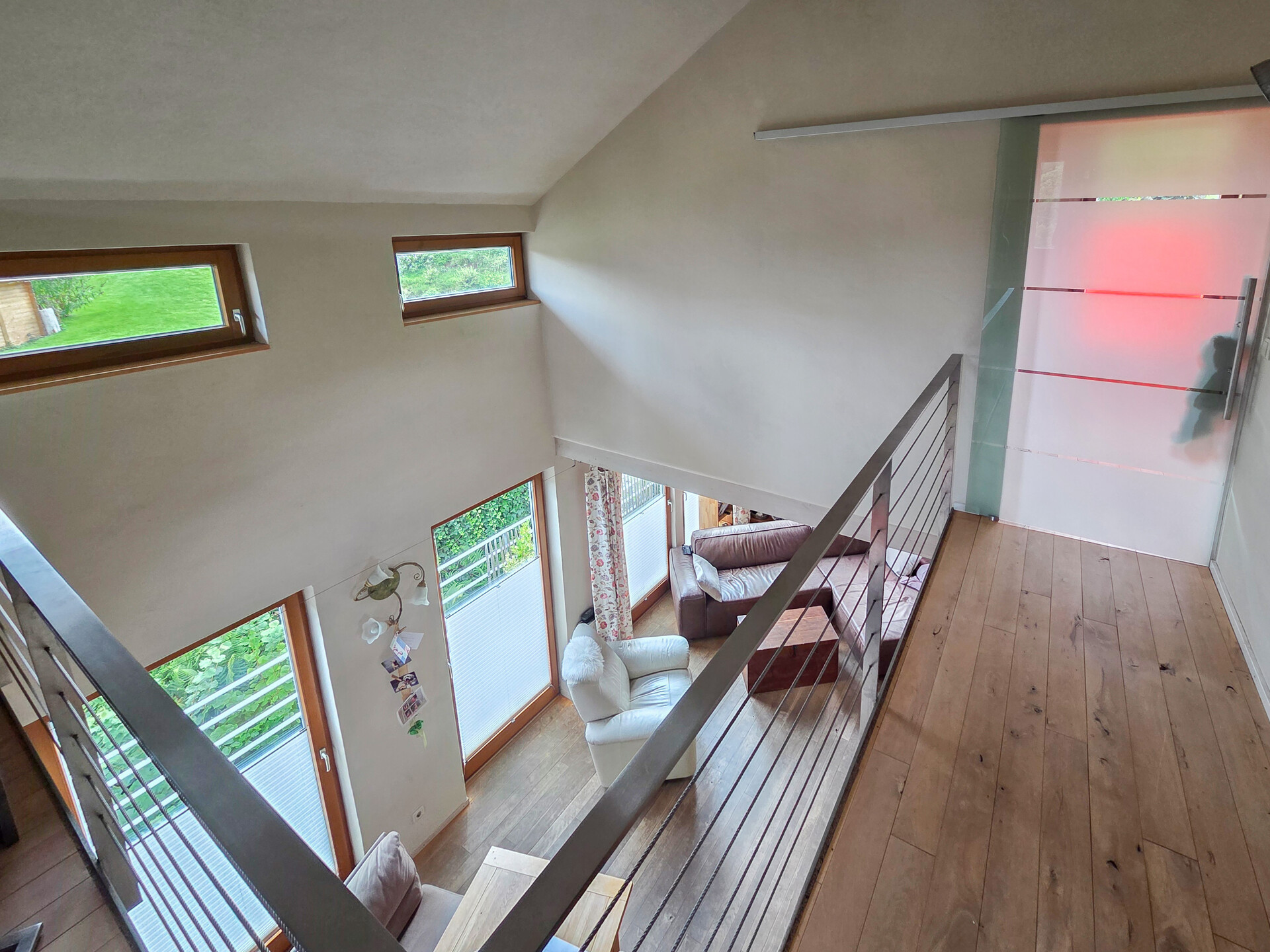 Das Haus wurde 2000 in ökologischer Holzständerbauweise errichtet, mit Holzfaserdämmplatten gedämmt und bietet ca. 177 m² Wohnfläche mit offen gestalteten Räumen, freiliegenden Balken, einer offenen Galerie und viel natürlichem Licht. Für ein gesundes Wohnklima sorgen 3 cm starker Lehm- und Marmormehlputz. Ein Kaminofen im Wohnzimmer sowie hochwertige Echtholzböden aus Buche schaffen eine warme, einladende Atmosphäre.