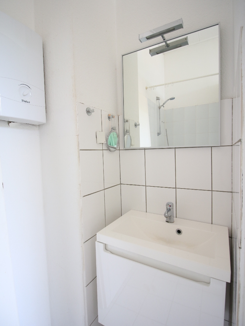 In allen Räumlichkeiten wurde Laminatboden verlegt. Der Duschbereich und das separate WC sind schlicht in weiß gefliest.