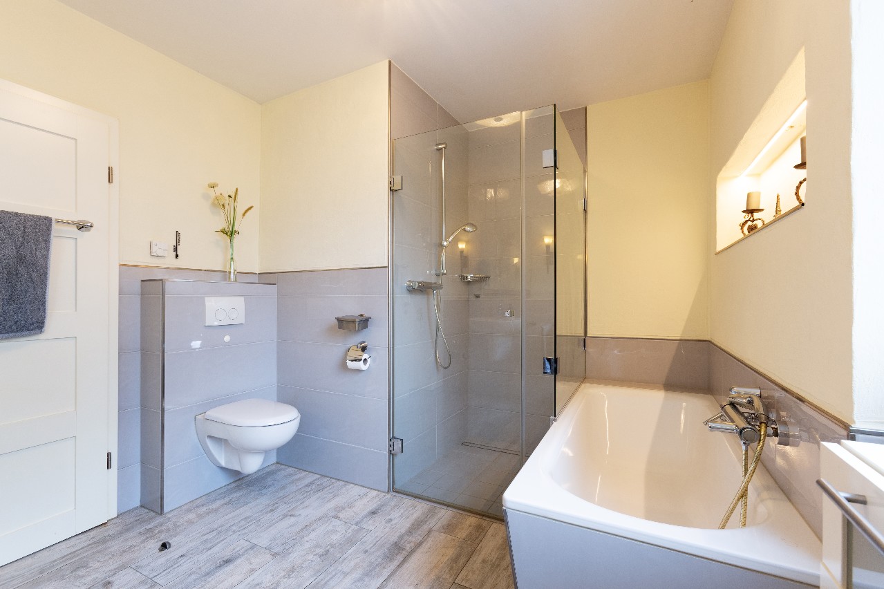 • Badezimmer mit barrierefreier Dusche und Badewanne