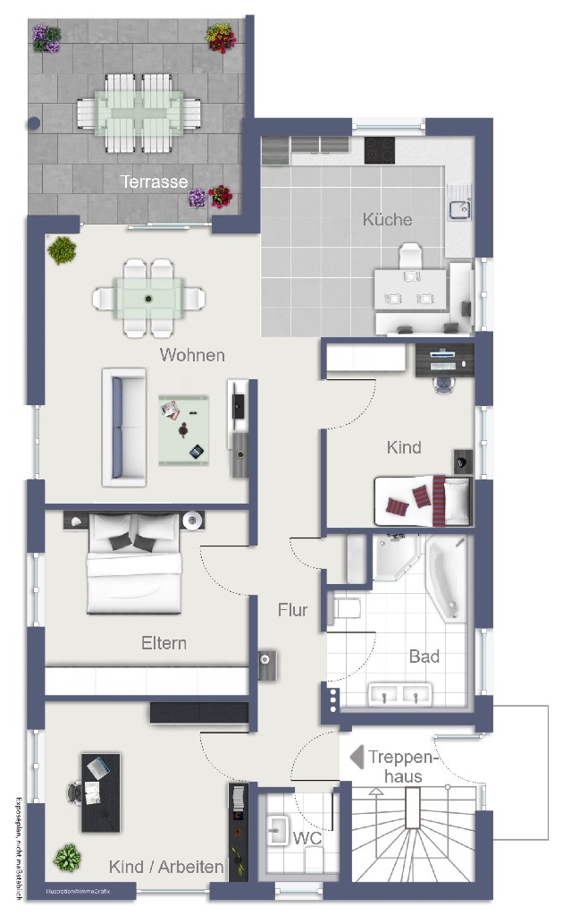 Der Mittelpunkt der Wohnung ist der großzügige Wohn-/Essbereich mit direktem Zugang zur Terrasse und in den Garten. Hier entsteht ein nahtloser Übergang zwischen Innen- und Außenbereich – ideal für entspanntes Wohnen und gesellige Stunden. Die Küche ist im Kaufpreis enthalten und fügt sich als vollwertiger Bestandteil optimal in das Wohnkonzept ein. Insgesamt stehen Ihnen neben dem Wohnbereich drei vollwertige Zimmer zur Verfügung – ob als Kinderzimmer, Homeoffice, Ankleide oder Gästezimmer. Komfortabel gestaltet sich ebenfalls der Sanitärbereich: Neben einem separaten Gäste-WC verfügt die Wohnung über ein hochwertiges Badezimmer mit Dusche und Badewanne, wodurch sowohl Alltags-tauglichkeit als auch Wohlfühlcharakter gewährleistet sind.