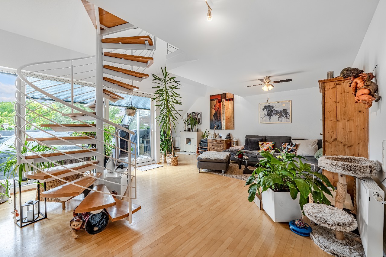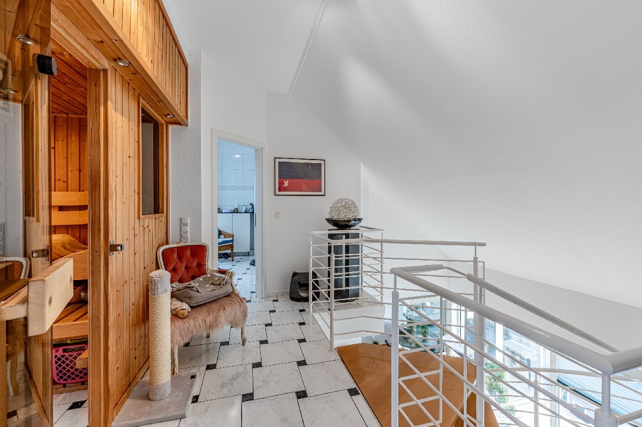 Eine filigrane Wendeltreppe führt ins Galeriegeschoss. Hier beeindruckt besonders der offene Galeriebereich mit Blick in das darunterliegende Geschoss die großzügige Deckenhöhe und der Lichteinfall schaffen ein luftiges, beinahe loftartiges Wohngefühl. Das Galeriegeschoss beherbergt ein geräumiges Elternschlafzimmer mit praktischen Einbauschränken sowie ein Tageslichtbad mit Dusche und Eckbadewanne. Ein weiterer, ursprünglich als Kinder- oder Gästezimmer geplanter Raum wird als private Sauna und Ruhezone genutzt. Ein Rückbau zur Nutzung als Büro oder Kinderzimmer ist auf Wunsch ohne großen Aufwand möglich. Von hier aus gelangen Sie direkt auf den zweiten, uneinsehbaren Balkon mit weitem Blick ins Grüne. Ein Rückzugsort mit echter Wellness-Qualität. Ein kleiner Abstellraum in der Dachschräge komplettiert die Wohneinheit.