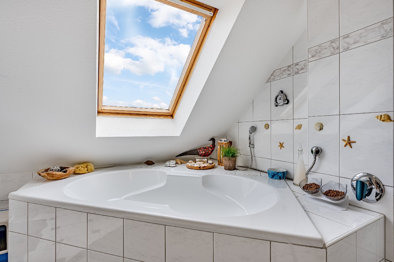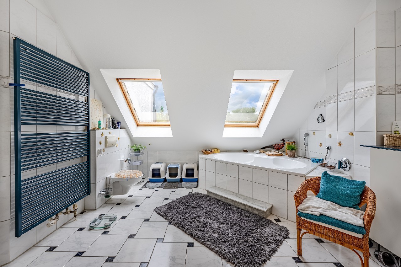 - Badausstattung: Dusche, Badewanne, Fenster im Badezimmer